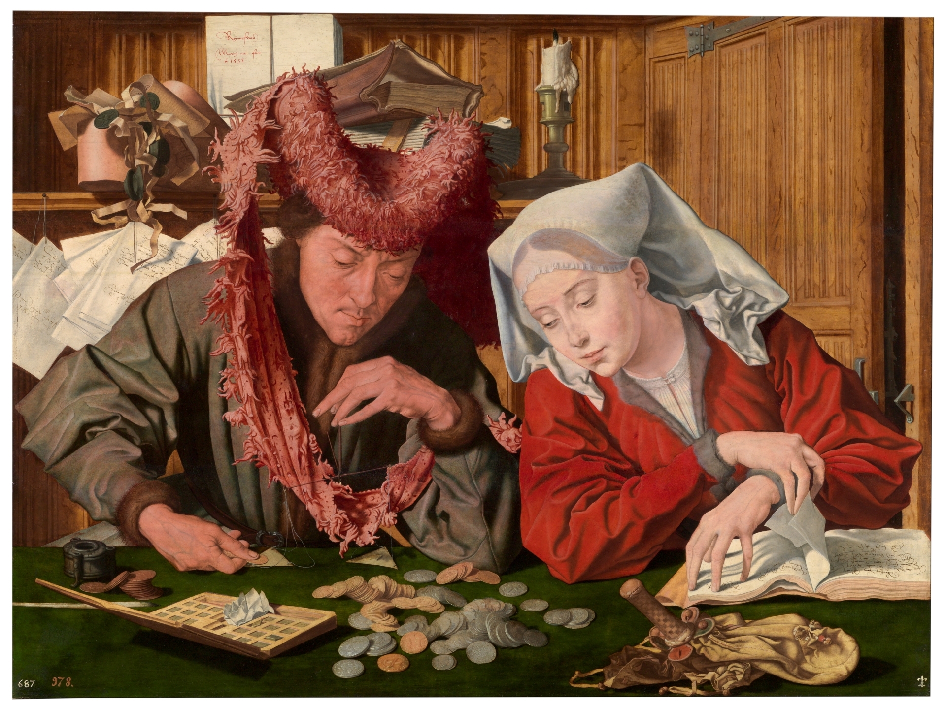 El tesorero municipal y su mujer (conocido como El cambista y su mujer), de Marinus van Reymerswale. Óleo sobre tabla de roble. 1538 Madrid.