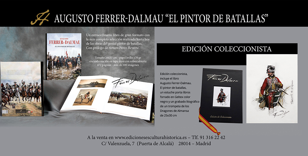 Ediciones y Escultura Histórica y Libertad Digital te presentan un extraordinario libro en edición coleccionista: El pintor de batallas, de Augusto Ferrer-Dalmau. Se trata de un ejemplar de gran formato que incluye la más completa selección realizada hasta hoy de las obras del genial pintor catalán. El escritor y gran amigo del artista, Arturo Pérez-Reverte, ha sido el encargado de escribir el prólogo.