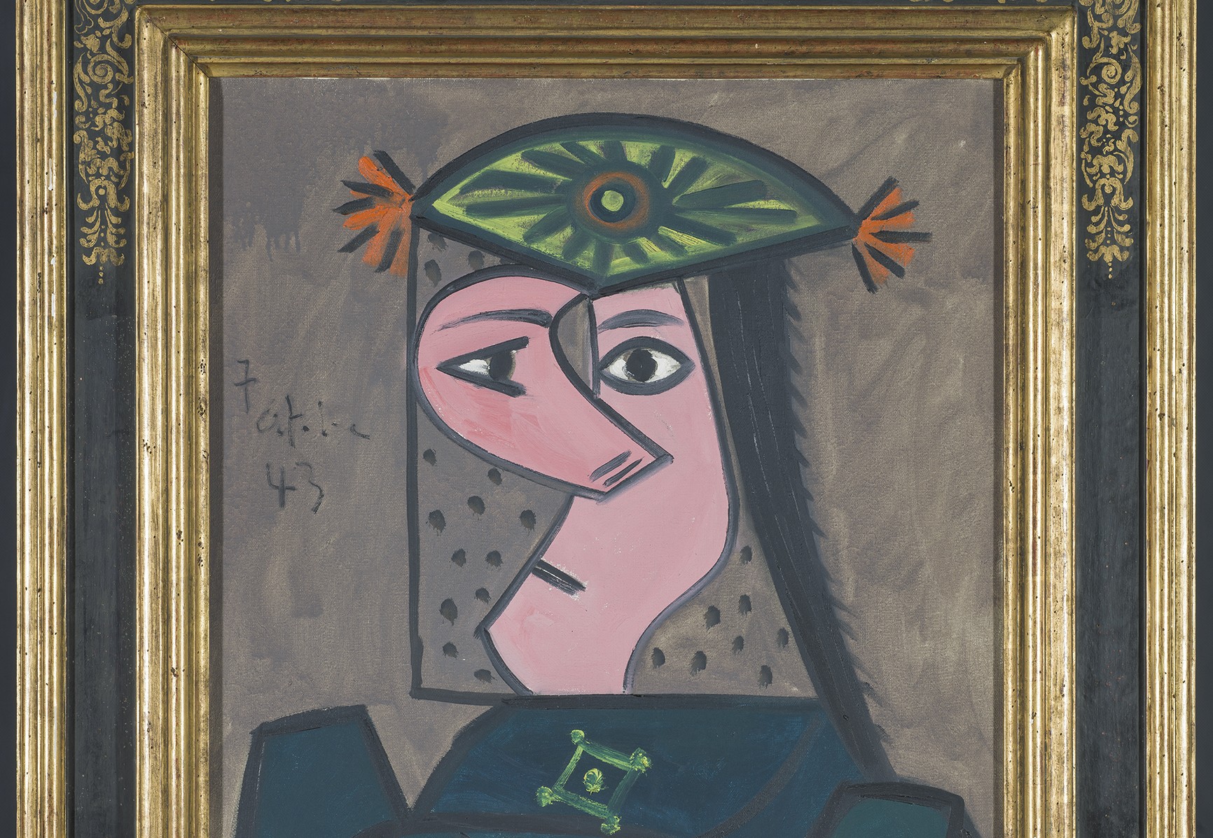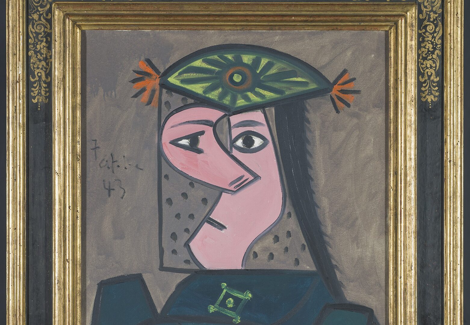 Busto de mujer, realizado en 1943, es una muestra de gran calidad de la respuesta de Picasso a la violencia de la II Guerra Mundial. En muchas de las imágenes femeninas pintadas en ese periodo el artista deformó los rasgos de las figuras de un modo radical. En esta, pintada en un solo día, lo hizo con trazos rápidos y muy seguros. La resonancia de los tonos del fondo y la rotunda presencia del tipo femenino revelan los ecos de su gusto por lo español y su profundo conocimiento de nuestra tradición pictórica. La obra será expuesta de manera inmediata en las salas de retratos del Greco, una de las referencias más evidentes en la pintura de Picasso.