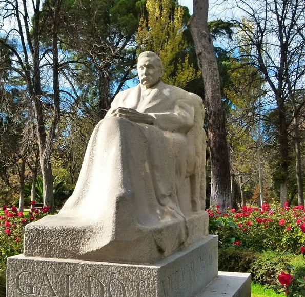Cargada de intenciones y llena de significado está la estatua de Galdós en El Retiro. Este segundo ejemplo pertenece al extraordinario escultor palentino Victorio Macho, quien también llevó a cabo el monumento a Santiago Ramón y Cajal muy cerca del estanque del parque. Situada detrás de una terraza en el Paseo de Uruguay, enfrente de la Rosaleda, el escritor aparece sentado en su butaca y con las piernas cubiertas por una manta, tal y como aparece en algunas fotografías de la época, cuando era ya un anciano. Obvio es manifestar que también esta escultura expresa con delicadeza y mesura la épica del esfuerzo, dedicación y trabajo de un hombre que ha perdido la vista en su oficio. La ceguera del artista, sin duda alguna, es el momento cumbre, único, que se recoge con precisión poética. Exacta. Pero Victorio Macho, como en el caso de Benlliure, no cierra, o mejor dicho, no encierra y aprisiona ese momento singular, ese canto al esfuerzo y al trabajo, como si solo tuviera un sentido. Falso. La singularidad de una obra de arte nunca debe rendirse a la extrema pasión o al paroxismo del dolor. Siempre tiene que dejar abierta la libre interpretación a quien la contempla. La estética de Lessing, sí, es invencible: "Lo que constituye el mérito de un hombre no es la verdad que posee o cree poseer, sino el esfuerzo que ha hecho para conquistarla".