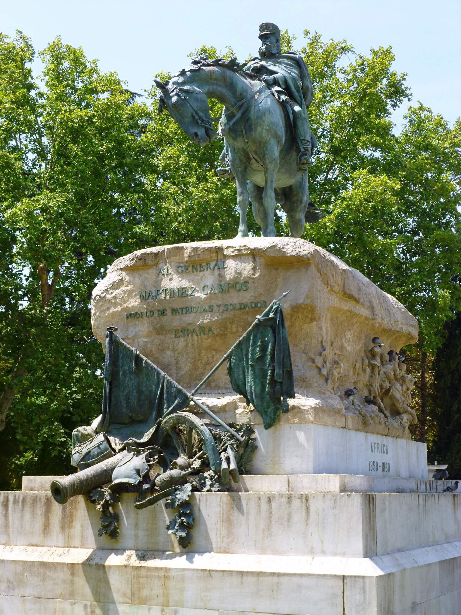 El monumento se inauguró en 1904, cuatro años después de su muerte, con amplia presencia institucional. Representa al general de uniforme de campaña, con capa y tocado con un ros, su caballo hace un gesto muy inusual, ladea e inclina e inclina la cabeza con aire cansado; algunos han interpretado la posición de la cabeza del equino para dar al jinete un mayor realce. Quizá. Pero yo tengo la sensación de que el gesto cansado del jinete no es menor que el de su caballo. El rostro de Martínez Campos, curtido en mil batallas -estuvo en las Carlistas, en la de Cuba y en la de África-, esculpido por Benlliure es una genuina obra de arte: es una síntesis perfecta del cansancio.