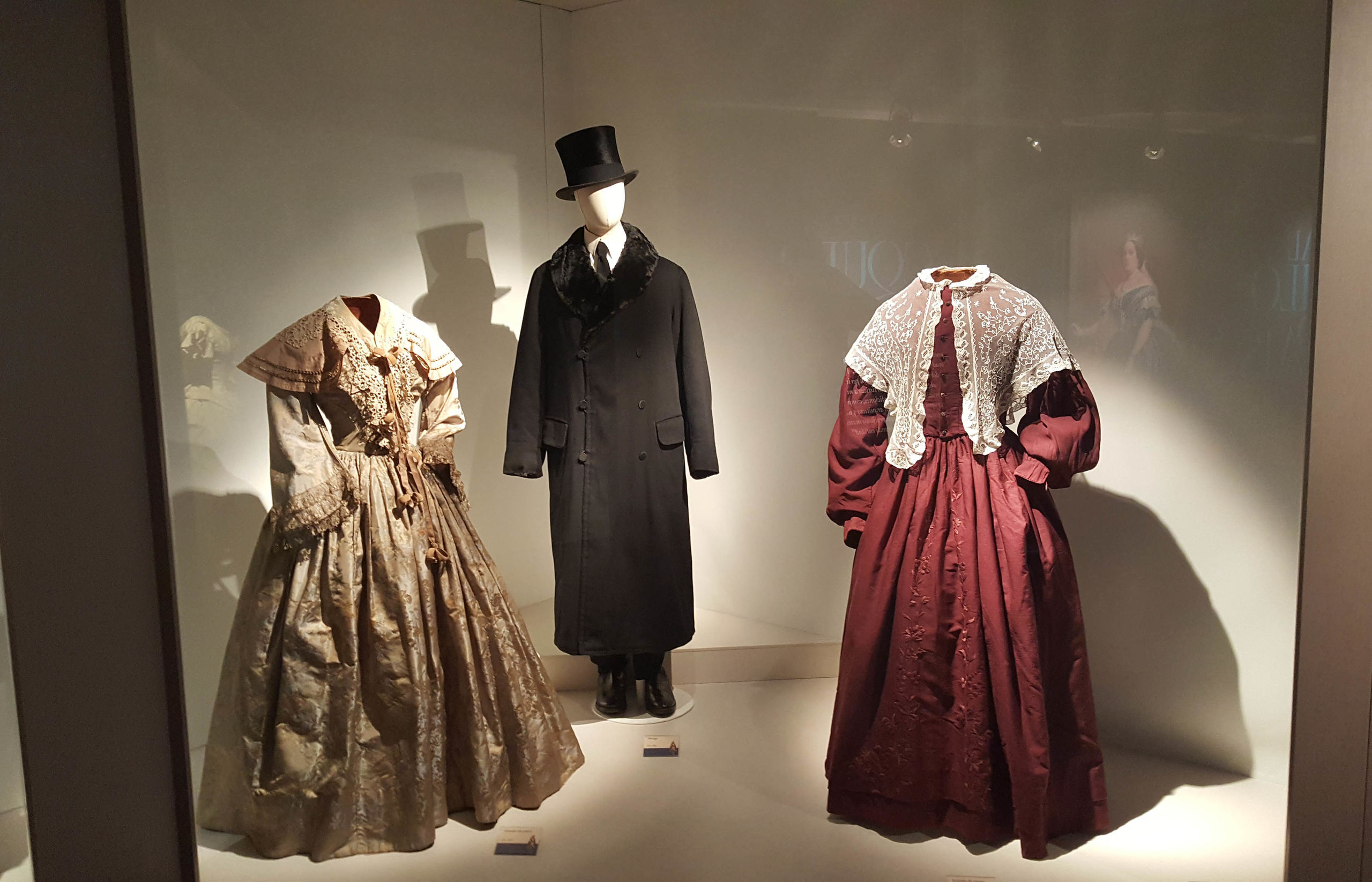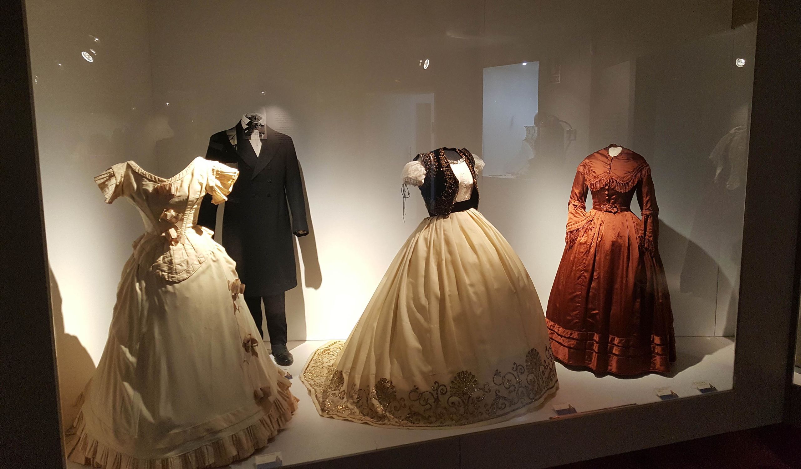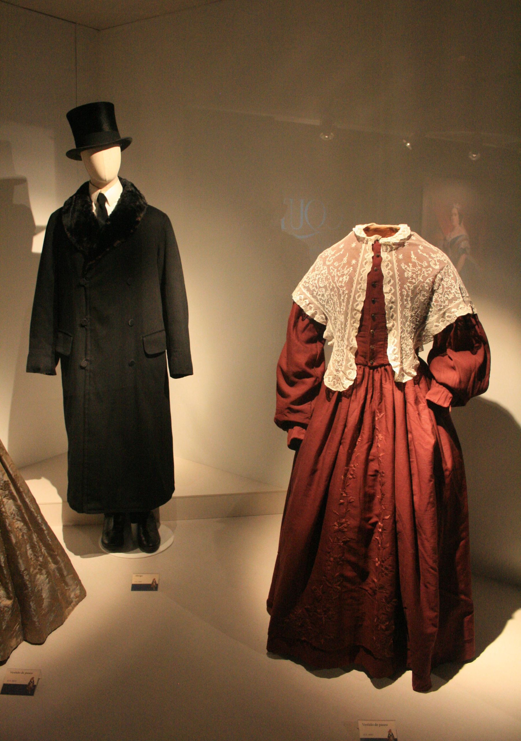 La exposición muestra los cambios en las formas de escotes, talles, mangas y volúmenes en las mujeres; y de modernos chalecos, fracs, levitas y sombreros en los hombres.