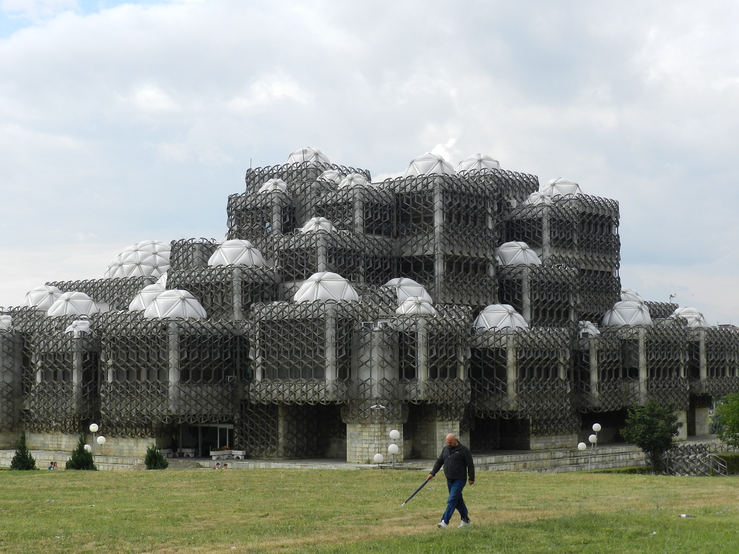 El señor que va paseando por ese campo de Kosovo (= “campo del mirlo” en serbio) no está dejando atrás la más sórdida prisión de la capital de su región o país (¡Pristina!) sino, corran a comprobarlo, la Biblioteca Nacional, que de cerca es aún más terrorífica y por dentro no-es-mejor. A vista de mirlo, sus 99 cúpulas le dan un aire muy distinto, como de Cabo Cañaveral.