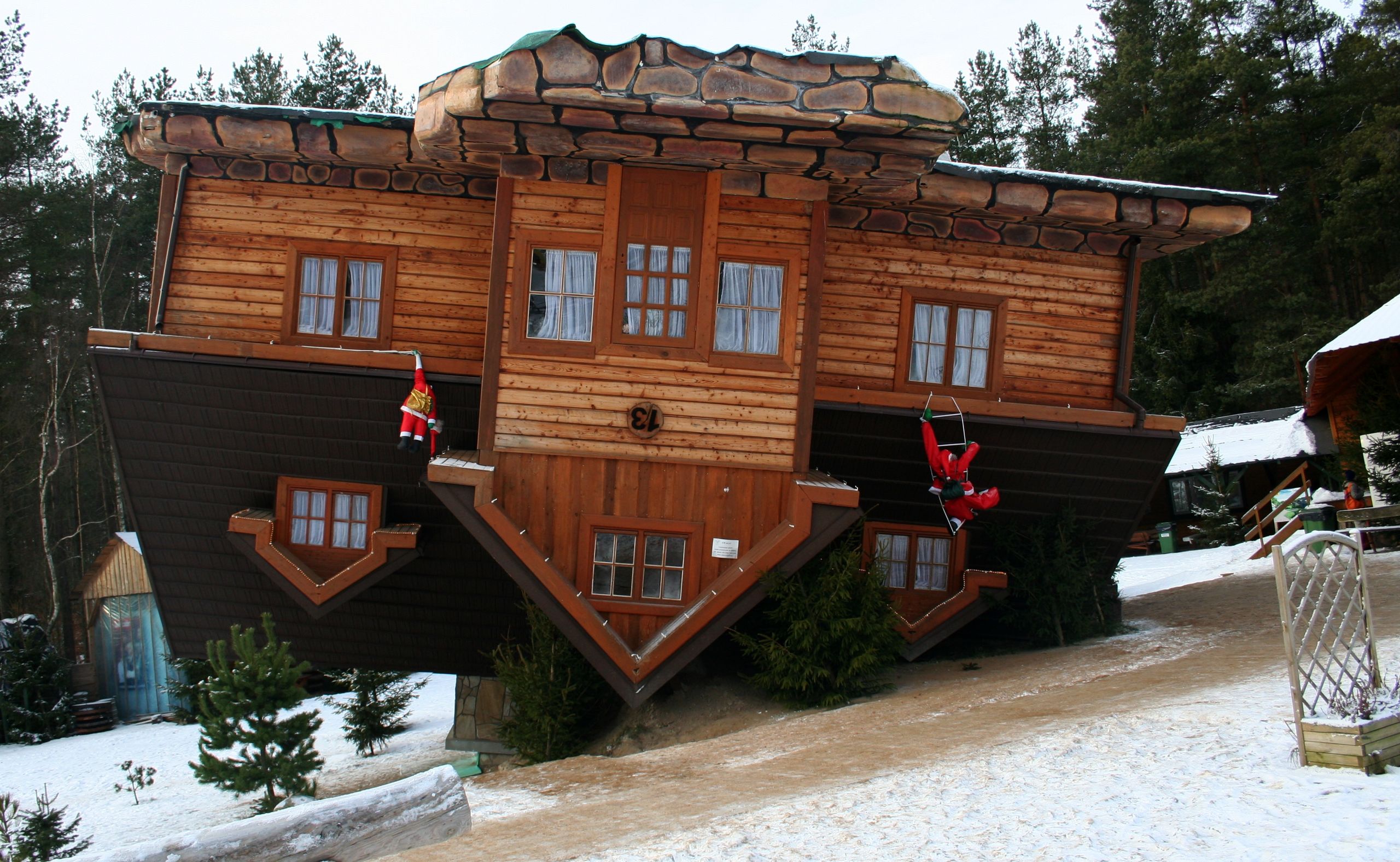 En esta casa que se alza o hace el pino a los pies del monte –con sus 329 metrillos, dejémoslo en colina– Wiezyca se entra por un ventanal y se camina por el tejado. El mundo al revés, que diría un comunista al ver que el mobiliario de esta atracción turística situada en la localidad de Szymbark (Pomerania –donde los perritos–) pertenece a la época en que su ideología criminal devastó Polonia. El Centro de Educación y Promoción Regional que acoge la Casa Bocabajo ofrece también al visitante la tabla de madera más larga del mundo (36,83 metros, 1,1 toneladas de peso), una mesa que perteneció al campeón de la libertad Lech Walesa, la Casa del Siberiano ("una granja procedente de Siberia que nos recuerda la tragedia de los exiliados polacos”) y un Museo del Carpintero con 2.300 objetos.