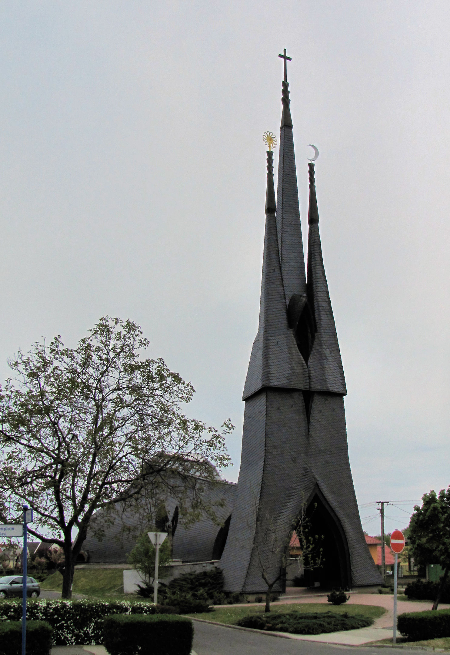 El nombre oficial de este batitemplo es Iglesia del Espíritu Santo, pero también se la conoce (seguro que no) como Iglesia Makovecz, por quien se la sacó del caletre, el arquitecto Imre Makovecz. Está radicada en la localidad húngara de Paks y, aunque no lo parezca, es bastante reciente, de los años 1987-88. Los húngaros no se anduvieron con chiquitas y recurrieron a todo para sacarse de encima al siniestro Joker comunista. En la página de promoción turística de Paks se nos dice que el templo fue costeado con donaciones y que, en pleno régimen comunista, los lugareños dedicaron gratis et amore 3.000 jornadas laborales a convertirla en realidad.