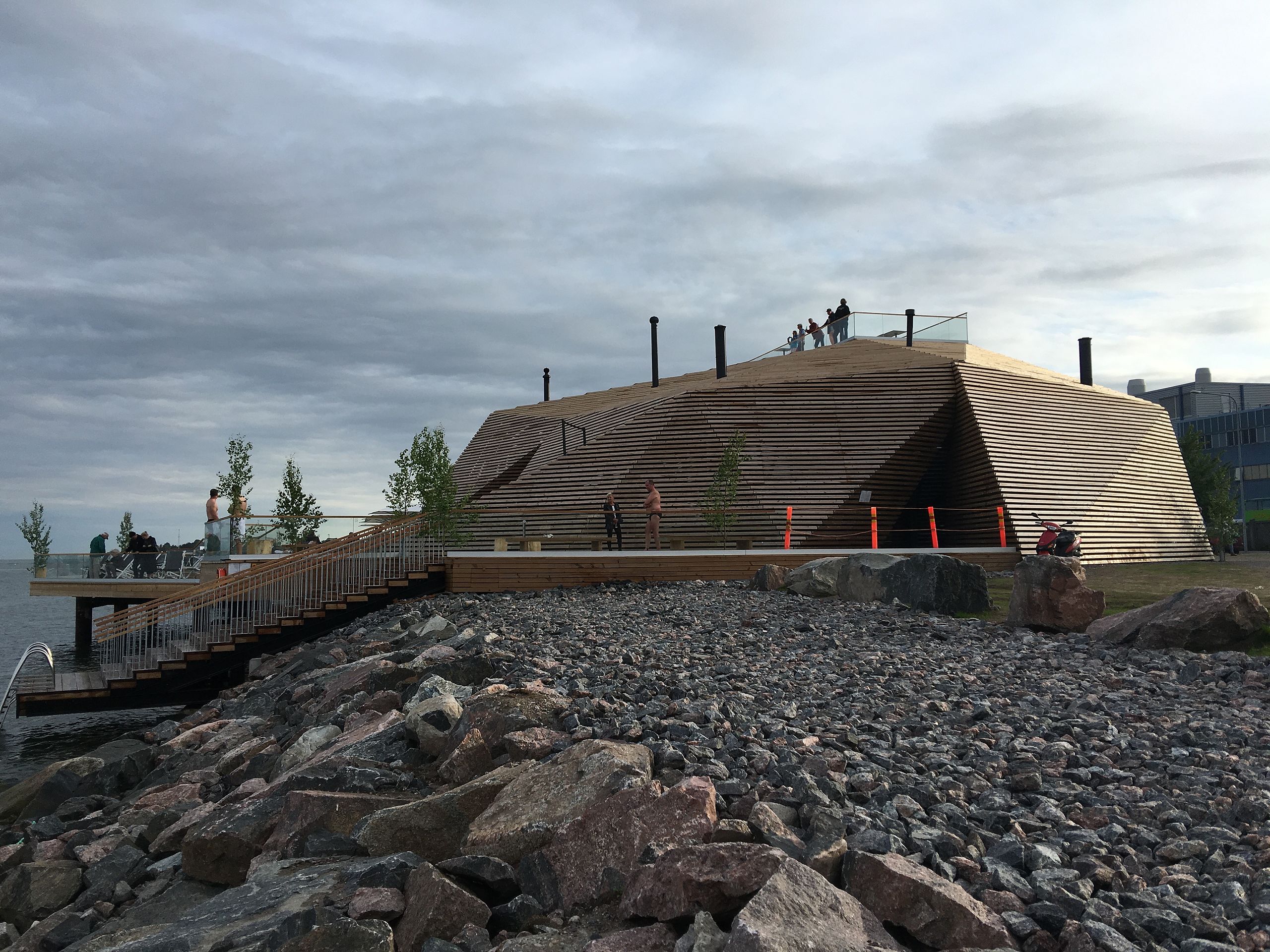 En el país de los 5,5 millones de habitantes y los 3,3 millones de saunas tienen esta megasauna de cemento, acero y madera de pino y abedul. Se encuentra en Hernesaari, Helsinki, y se llama Löyly, como el vaporcito que sale de la kiuas cuando le viertes agua encima.