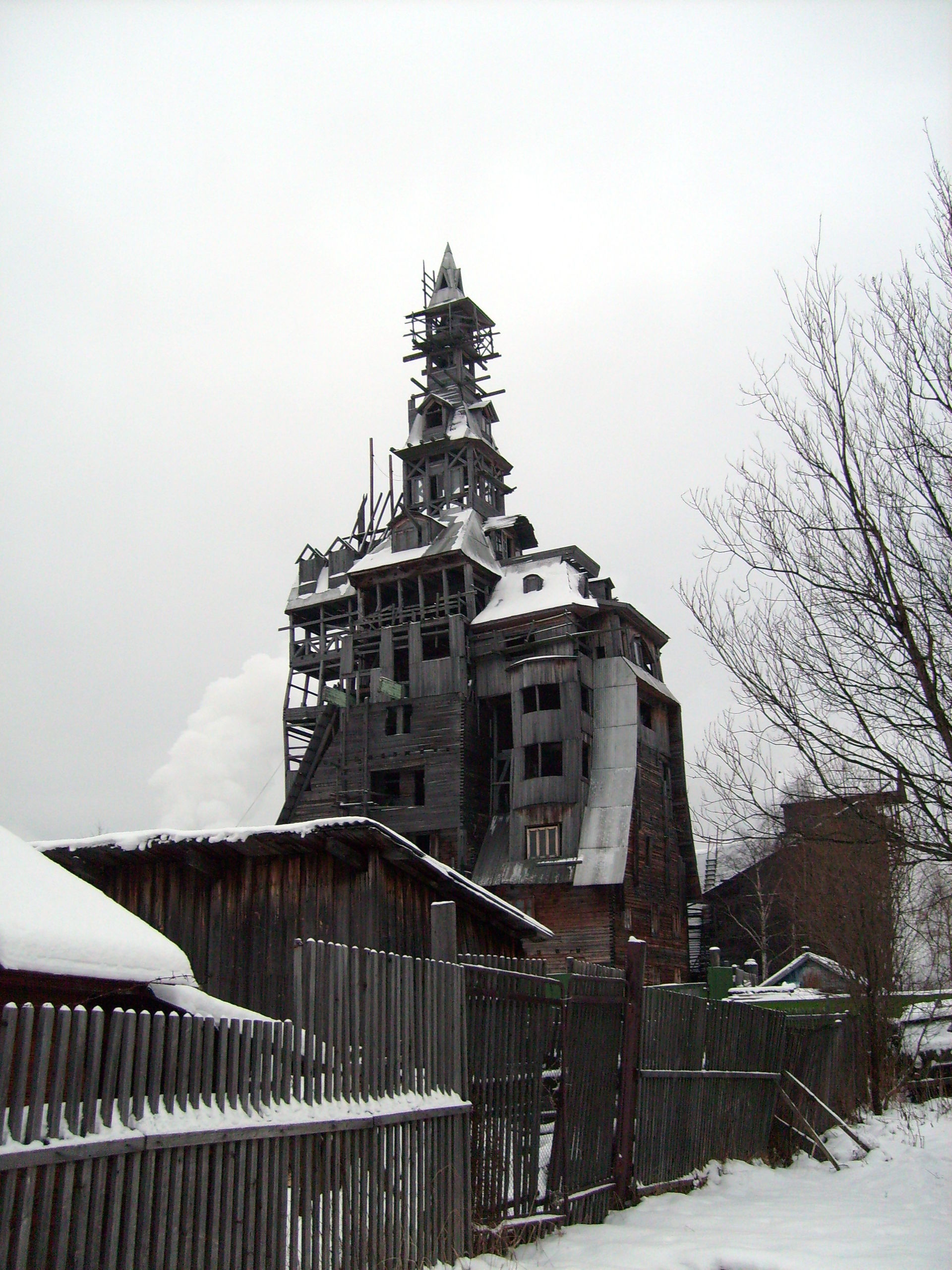En un primer momento anduve buscando por los diccionarios un gagster; pero había errata: la “Wooden Gagster House" remitía a un gángster, un tal Nikolái Pétrovich Sutyagin que empezó a construirla sin orden ni concierto allá por 1992 y que, por criminal, acabó condenándose –a una larga estancia en prisión– y condenando su bastión de los horrores: en 2008, las autoridades del lugar (el gélido Arcángel ruso) ordenaron su demolición por el riesgo de incendio que representaba. Y el fuego precisamente fue lo que acabó con el cuerpo principal, una estructura de cuatro alturas, el 6 de mayo de 2012. Al parecer, en su día la Casa Sutyagin fue –con sus 44 metros distribuidos en 13 plantas– el edificio de madera más alto del mundo, “o al menos de Rusia" –se pone cautelosa la Wikipedia, que informa de que superaba incluso a la iglesia del pogost Kijí, a la que también hemos dado cabida en esta galería.