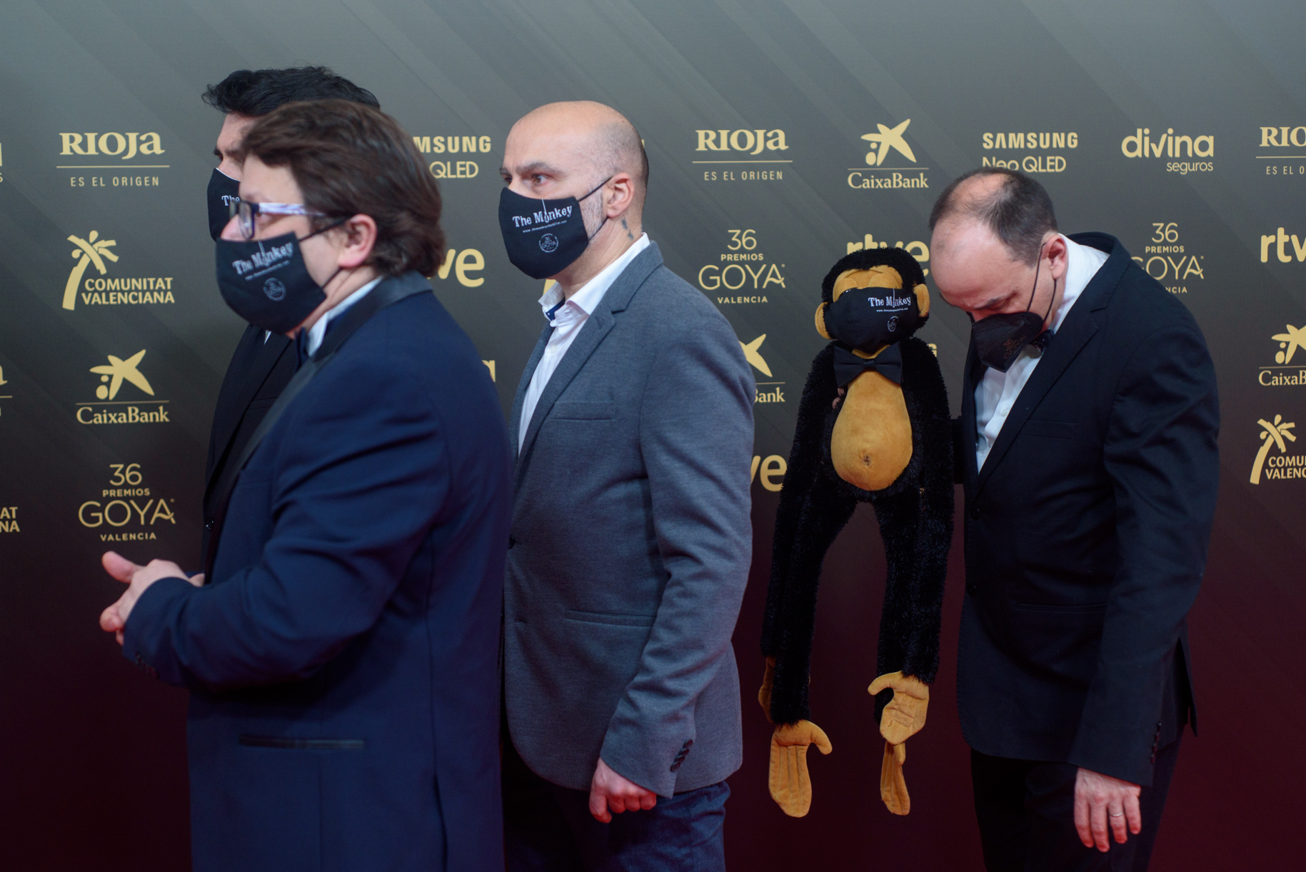 Los nominados por el corto de animación The Monkey, con una marioneta.