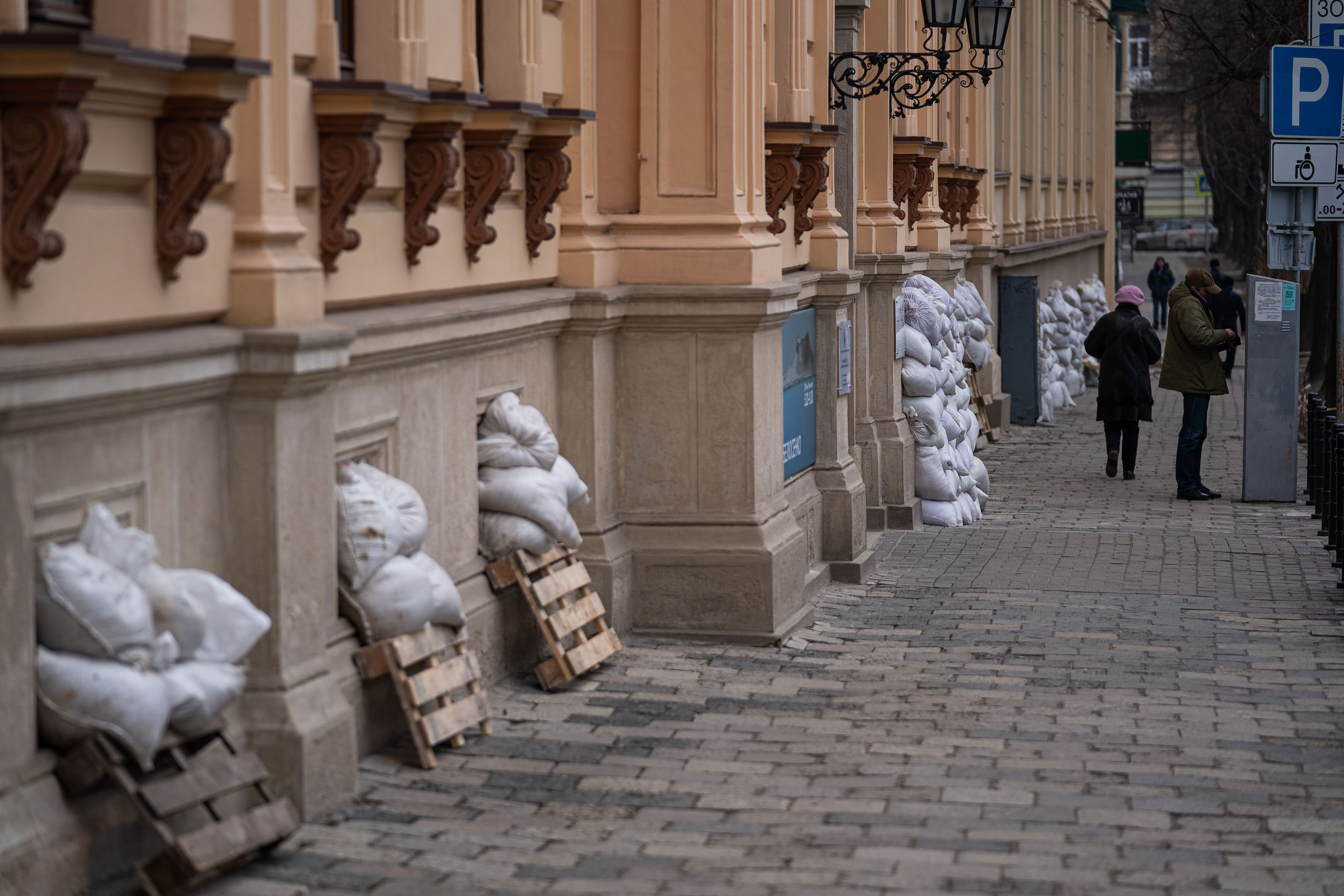 Una calle con sacos de arena para contener los ataques rusos en Leópolis (Lviv).