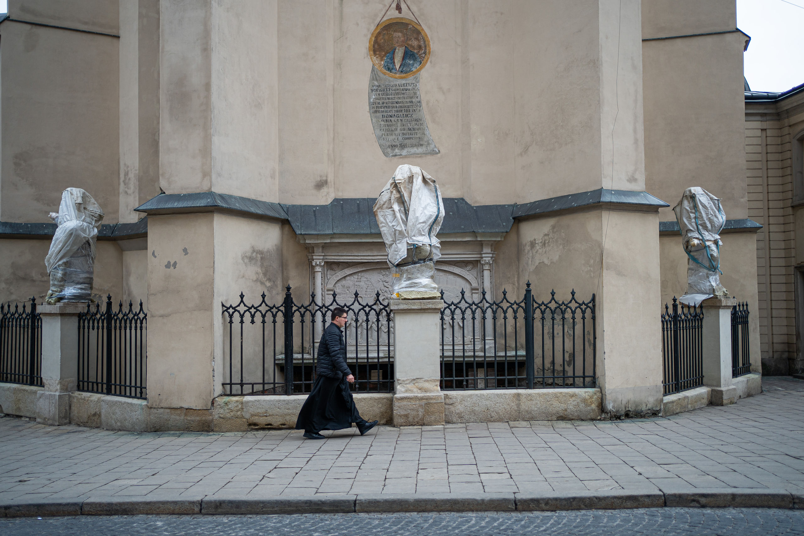Un cura pasea por el exterior de la Catedral Latina, con sus estatuas protegidas ante un posible ataque ruso, en el casco antiguo de Leópolis (Ucrania).