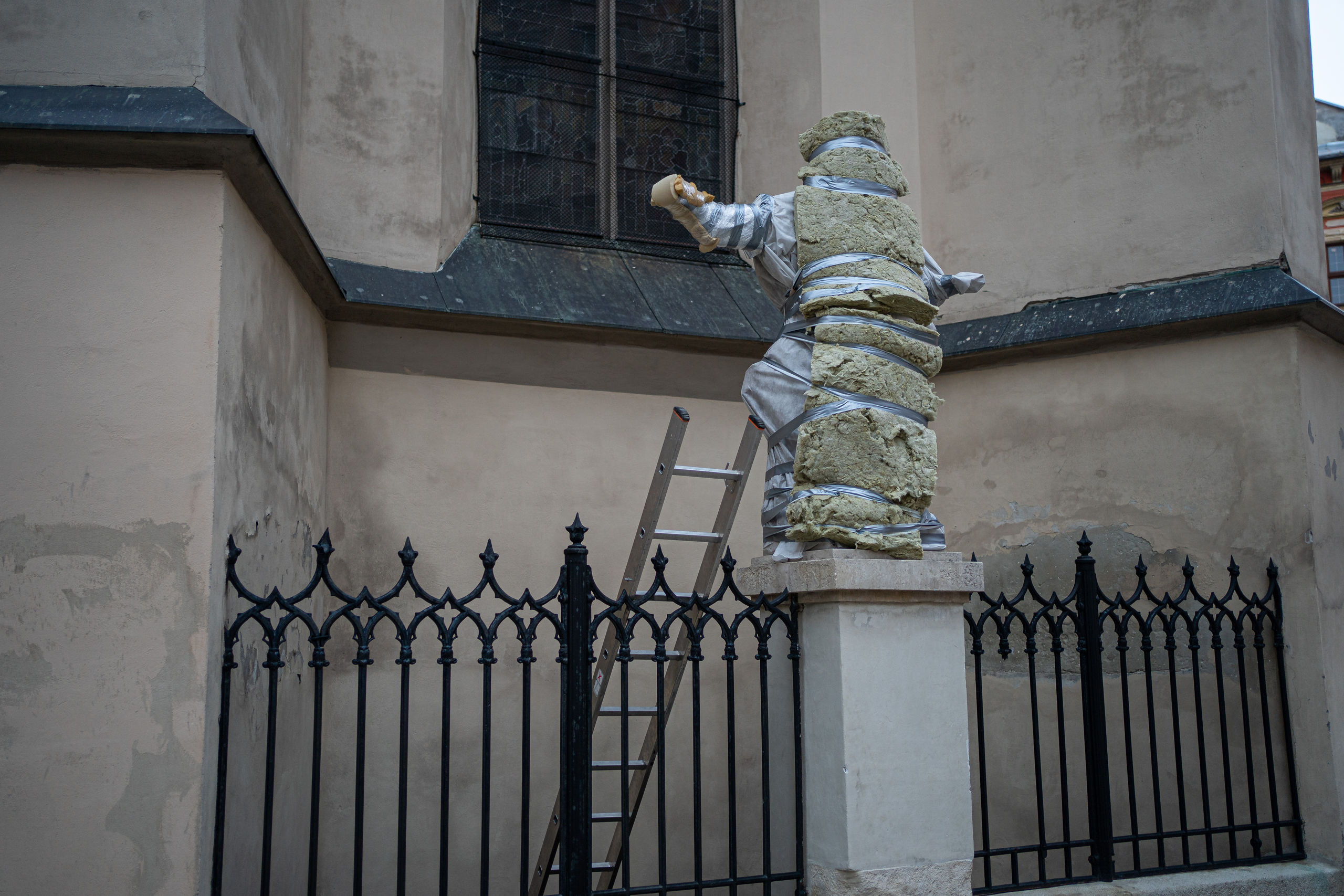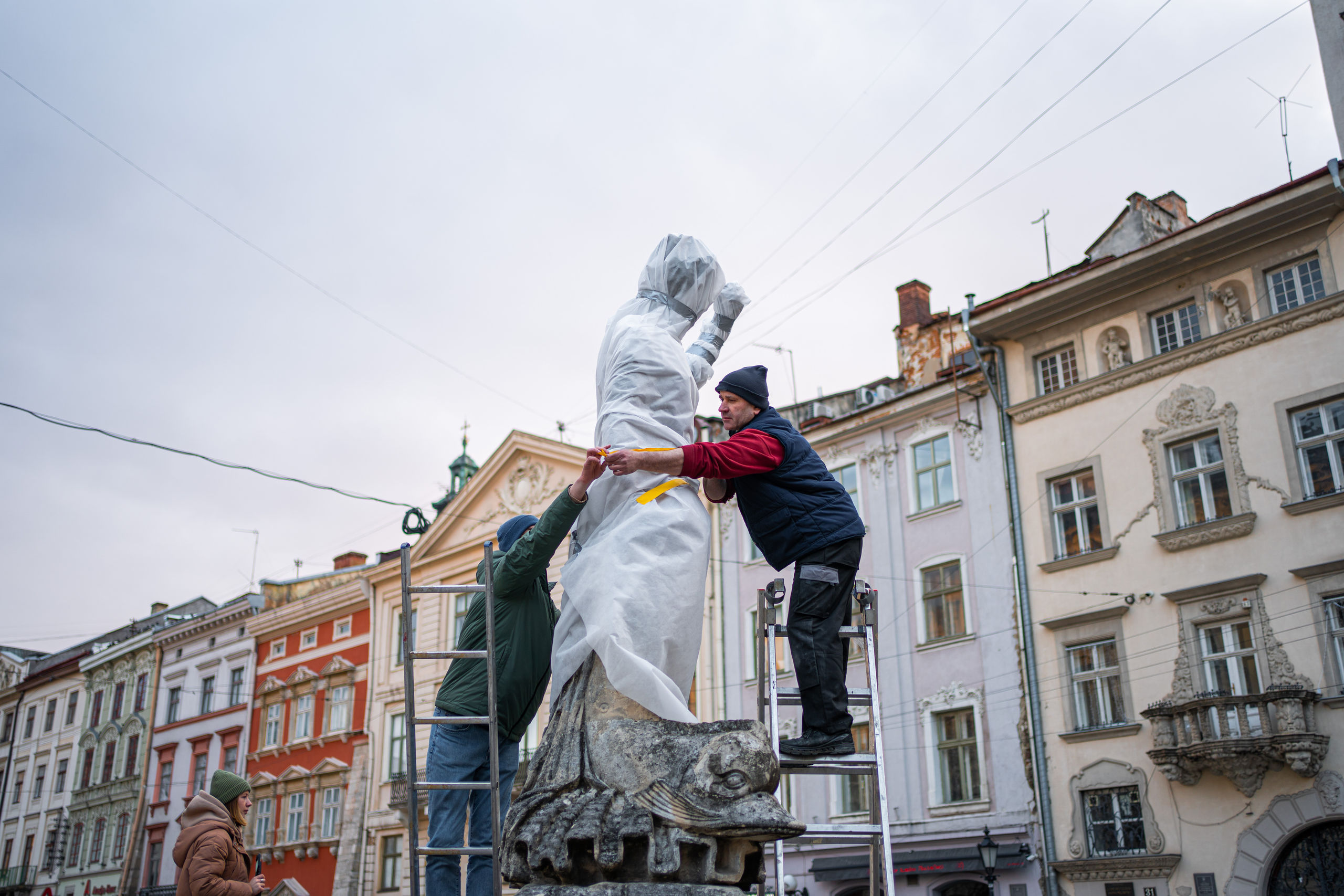 Operarios ucranianos protegiendo una estatua del centro de Leópolis de los ataques rusos (Ucrania).