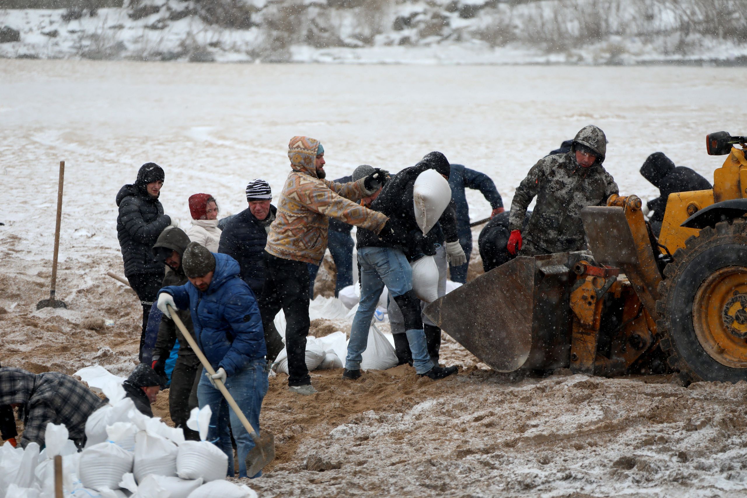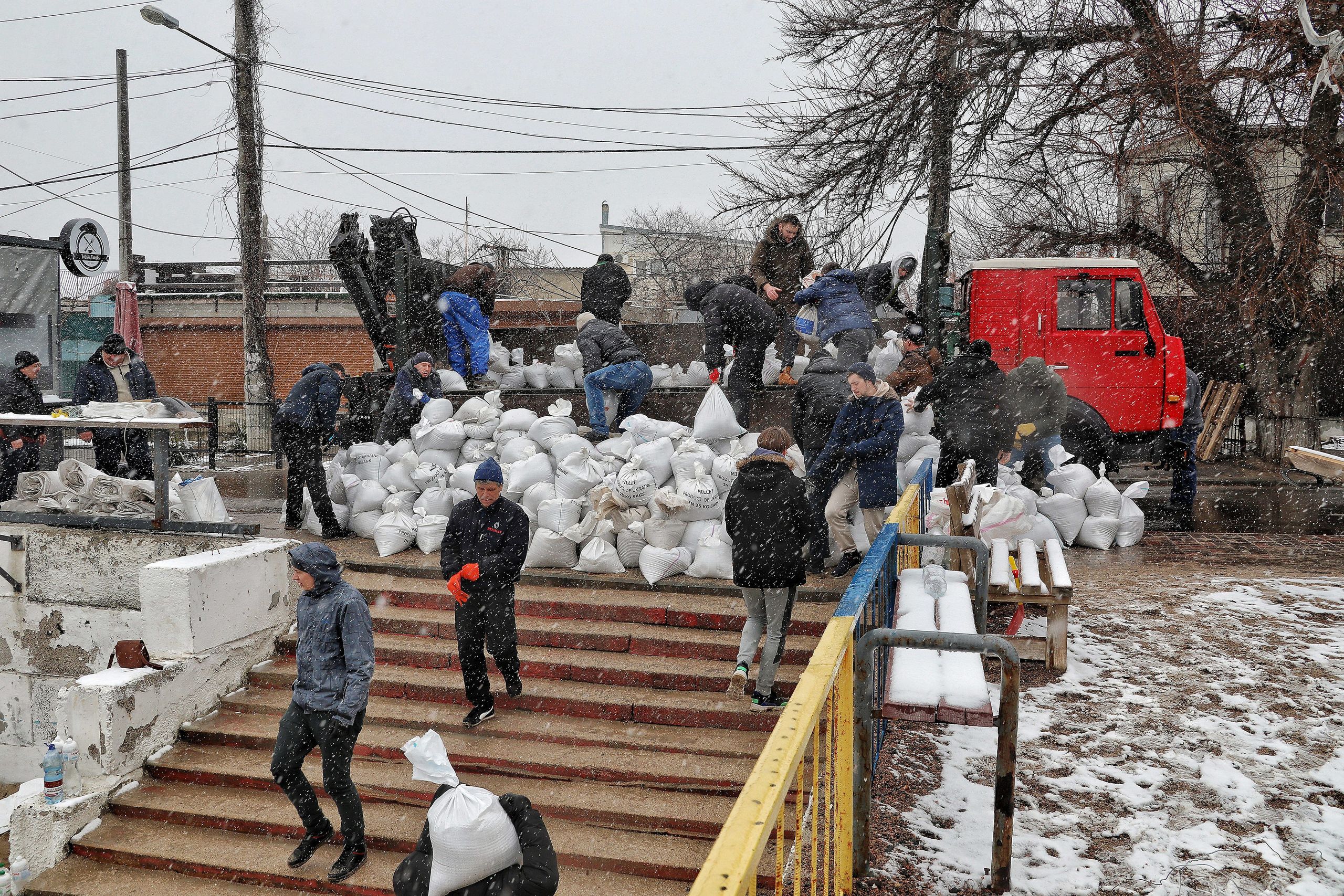 Varios vecinos e la ciudad de Odesa cargan sacos de arena en el camión para defender la ciudad de la inminente invasión rusa.