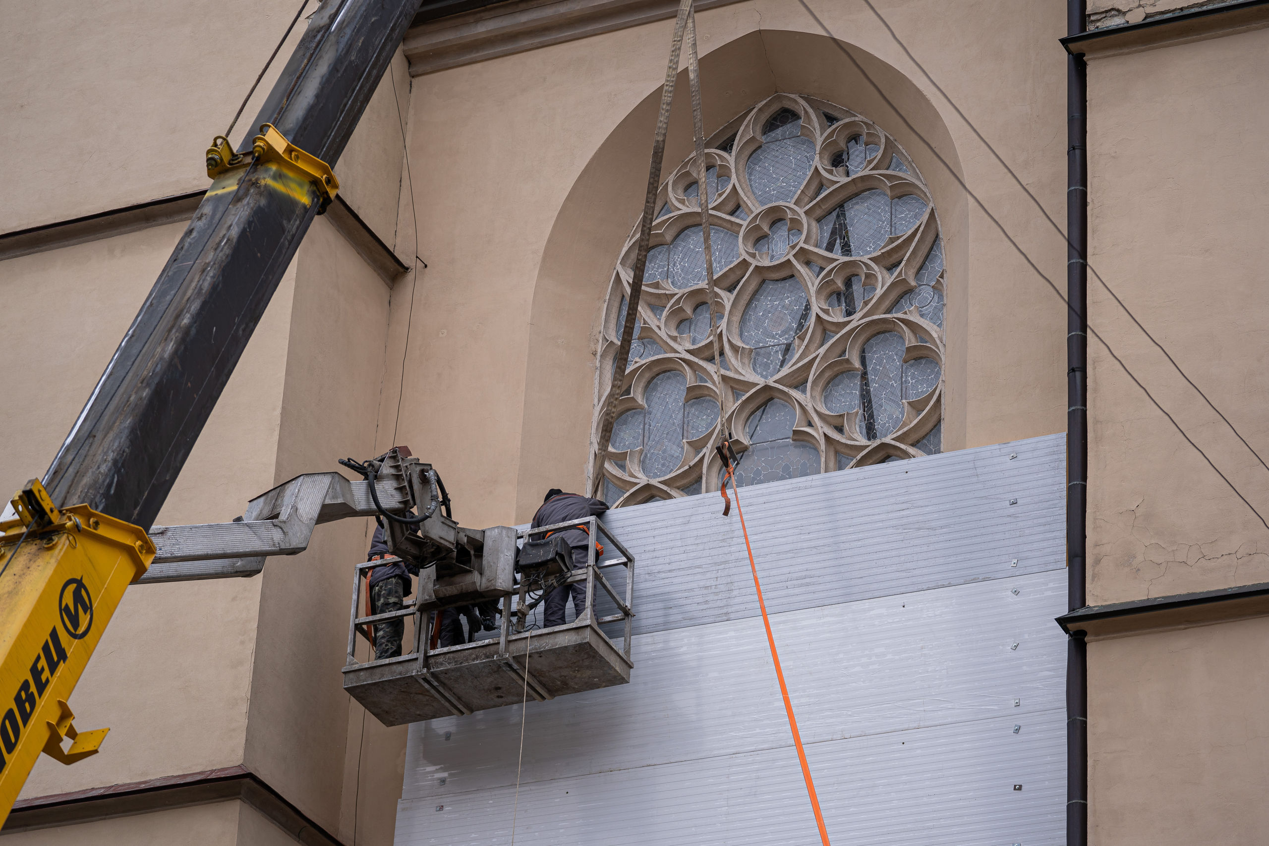 Operarios protegen el vitral de la Catedral Latina, en el casco antiguo de Leópolis (Ucrania).