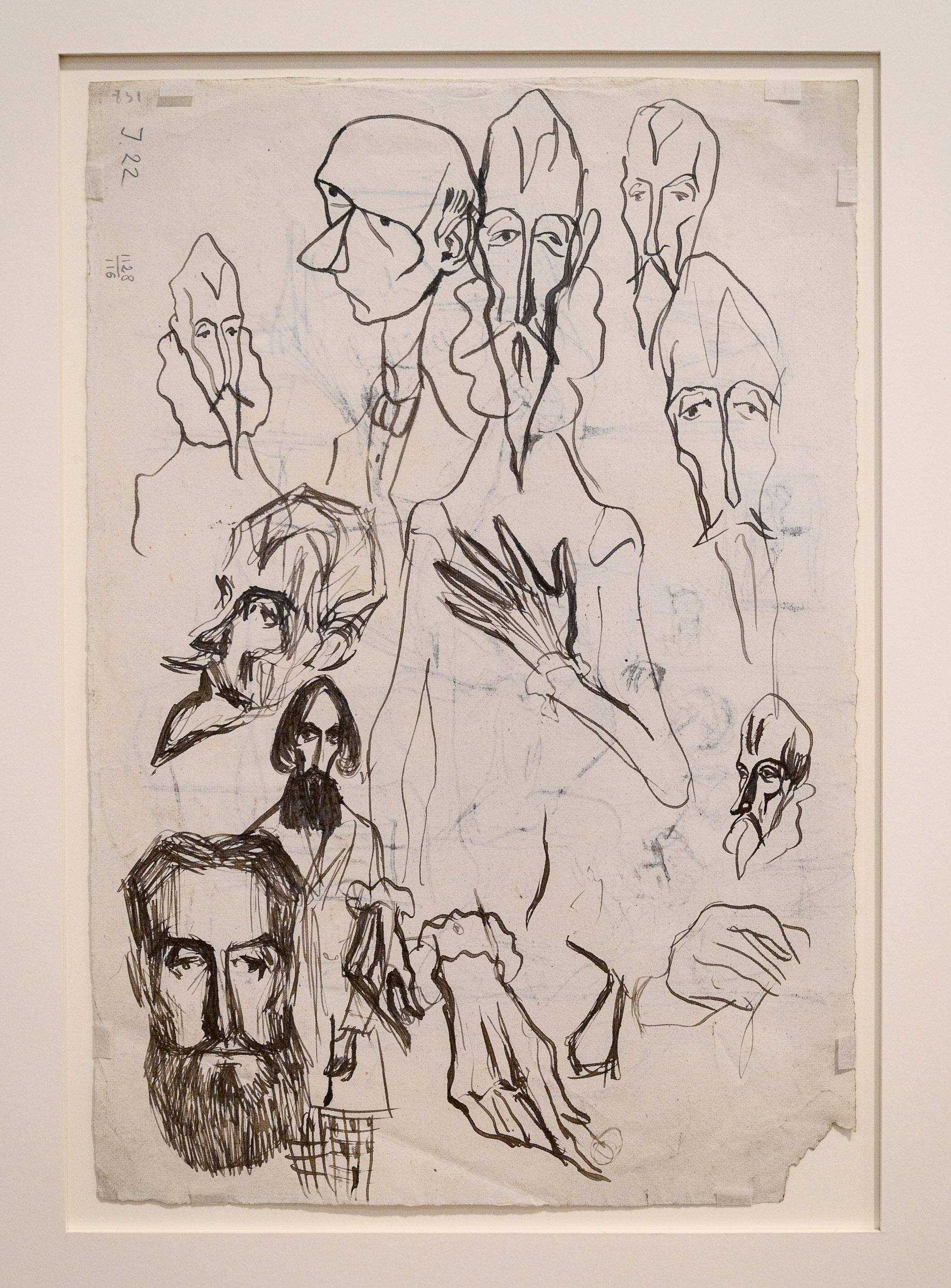 La muestra arranca con una serie de bocetos y estudios en los que Picasso dibuja numerosos personajes con rostro, actitud y hasta ropajes muy parecidos a los de retratos de El Greco, para luego adentrarse en comparaciones en las que, colgados uno junto al otro, los óleos de ambos pintores nos descubren de pronto un paralelismo que va más allá de un parecido que no siempre es evidente –aunque en algún caso también lo hay– y que, creo, es un excelente resumen de cómo un gran artista influye en otro: no es que el malagueño pinte como el cretense, pero de alguna forma se observa con cierta claridad que ha asimilado su obra.
