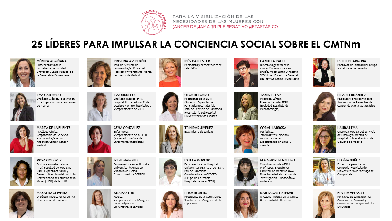 Las ex ministras de Sanidad, Ana Pastor y Trinidad Jiménez; las oncólogas médicas Eva Carrasco o Eva Ciruelos; las presidentas de la Sociedad de Farmacia Hospitalaria (SEFH), de Sociedad Española de Psicooncología (SEPO) o de la Sociedad Española de Enfermería Oncológica (SEEO), Olga Delgado, Tania Estapé y Gema González; o la periodista y presentadora, Inés Ballester, son algunos de las expertas que participan en esta coalición para visibilizar las necesidades urgentes en CMTNm relativas al acceso a tratamientos y terapias, mejoras en el diagnóstico, el acompañamiento integral de las pacientes abordado desde múltiples disciplinas o la reivindicación de una atención basada en la excelencia.