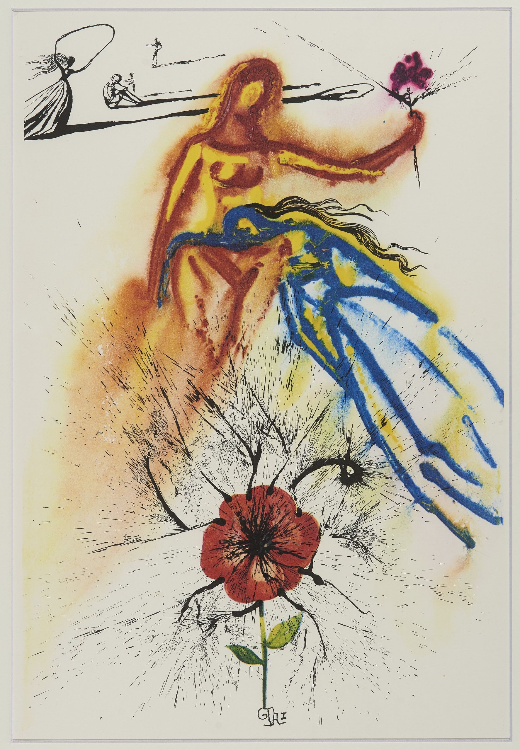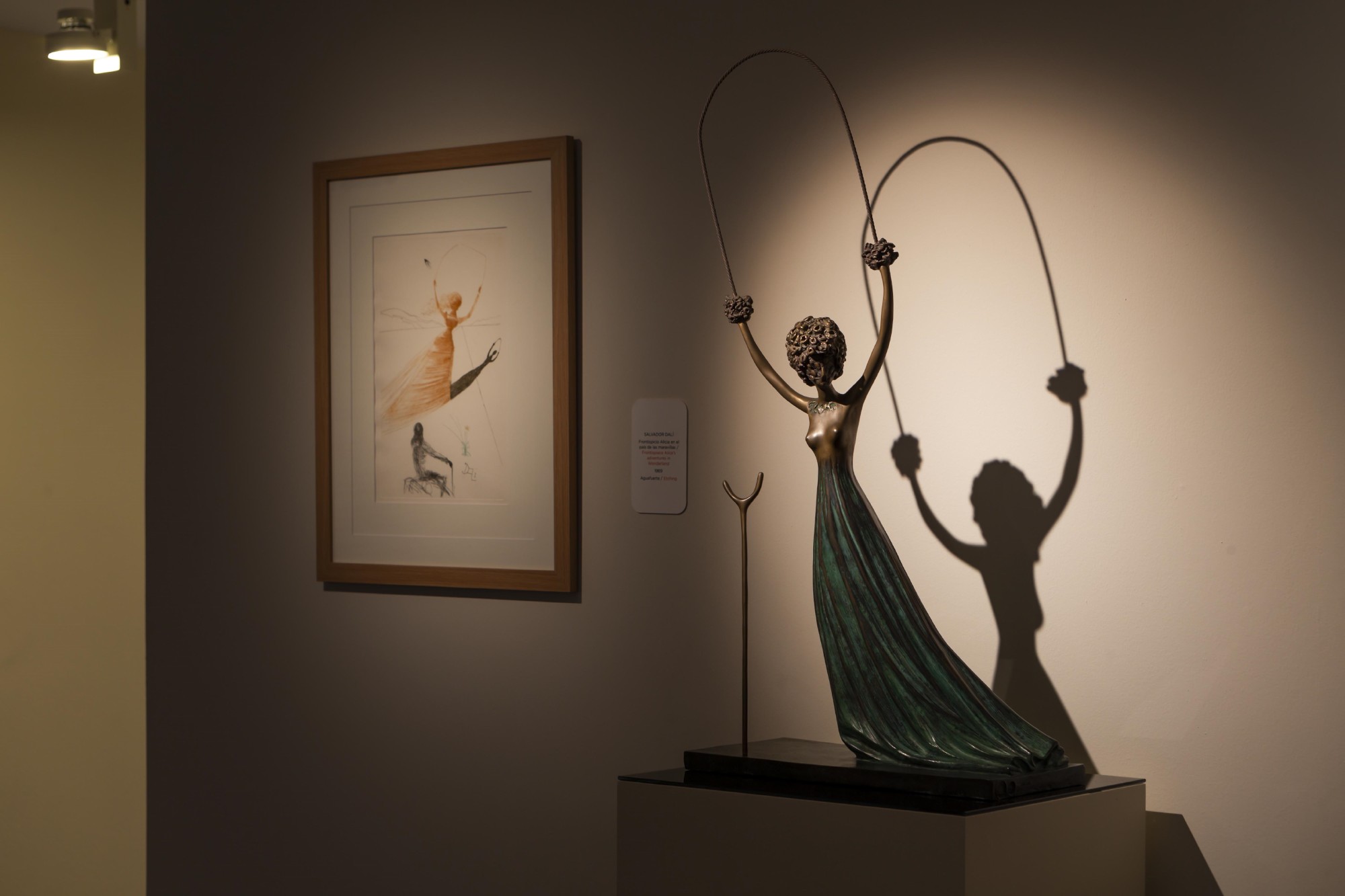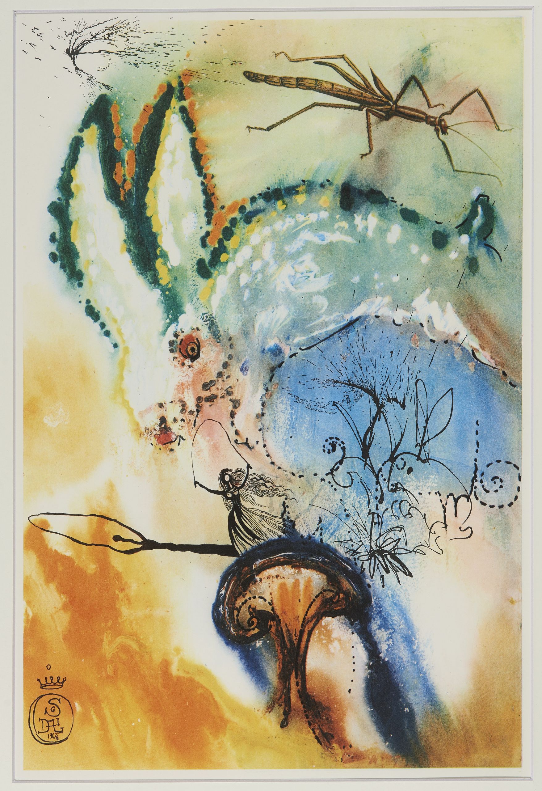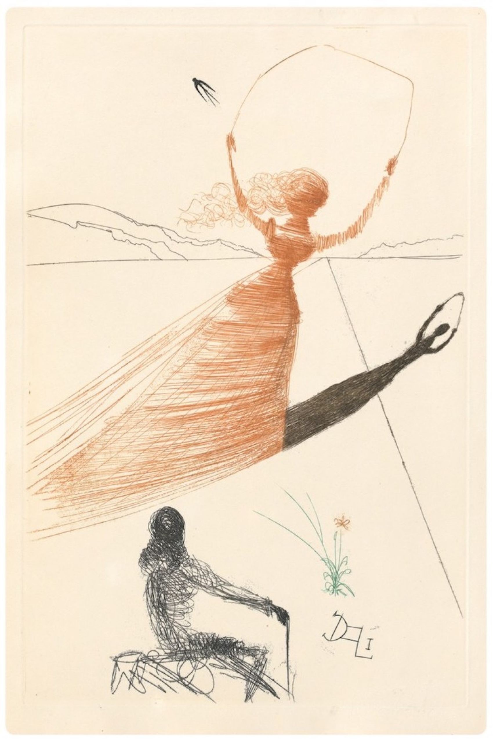 La serie de 13 grabados de Dalí que encontramos en la exposición fueron un encargo de Maecenas Press – Random House de Nueva York en 1969 para ilustrar una edición de la famosa novela de Carroll. Cada grabado ilustra uno de los 12 capítulos del libro, más el del frontispicio. En todos ellos, Alicia aparece representada como una joven saltando a la cuerda. | Salvador Dalí, “Frontispicio de Alicia en el país de las maravillas”, 1969.