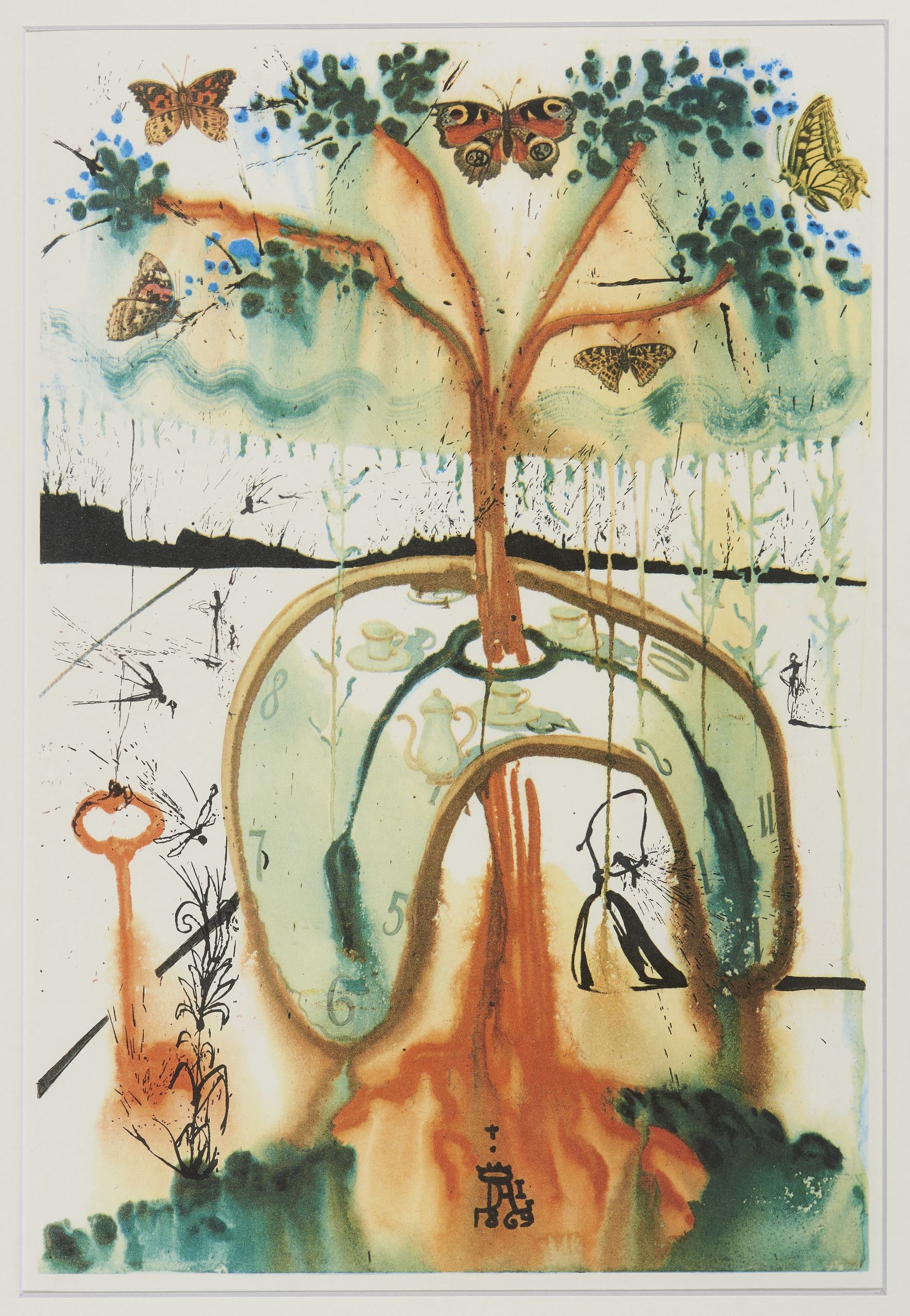“El tiempo y la metamorfosis son dos claros protagonistas de la novela de Lewis Carroll a la vez que elementos fundamentales en la obra de Salvador Dalí", dicen desde la exposición. | Salvador Dalí, “El testimonio de Alicia”, 1969.
