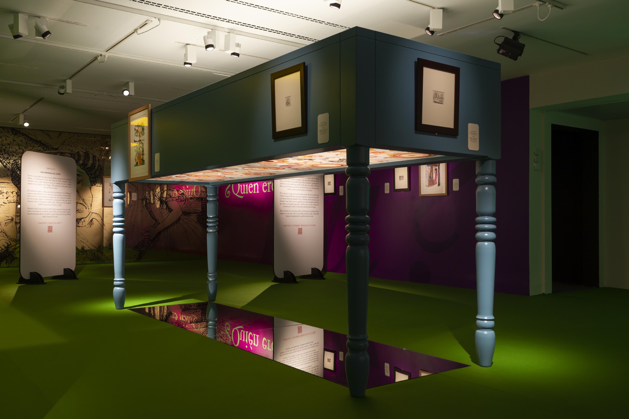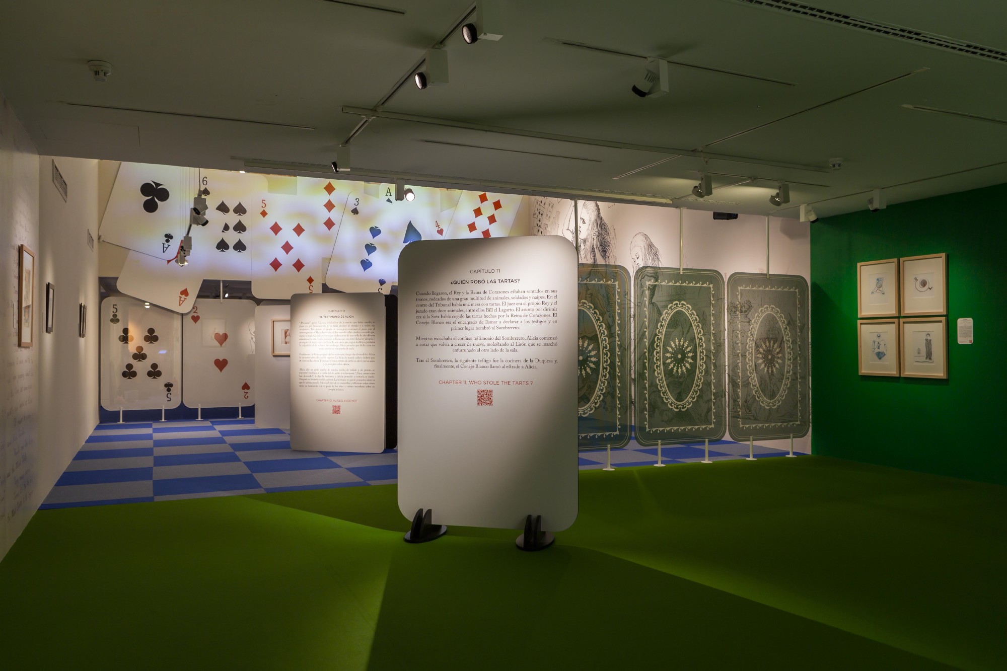En el diseño expositivo, realizado por Enrique Bonet, cada capítulo del libro se corresponde con una sección en la exposición y lo recrea para que el visitante pueda seguir la historia de Alicia a través de las obras expuestas, introduciéndolo en la reconocible iconografía del imaginativo universo de la protagonista.