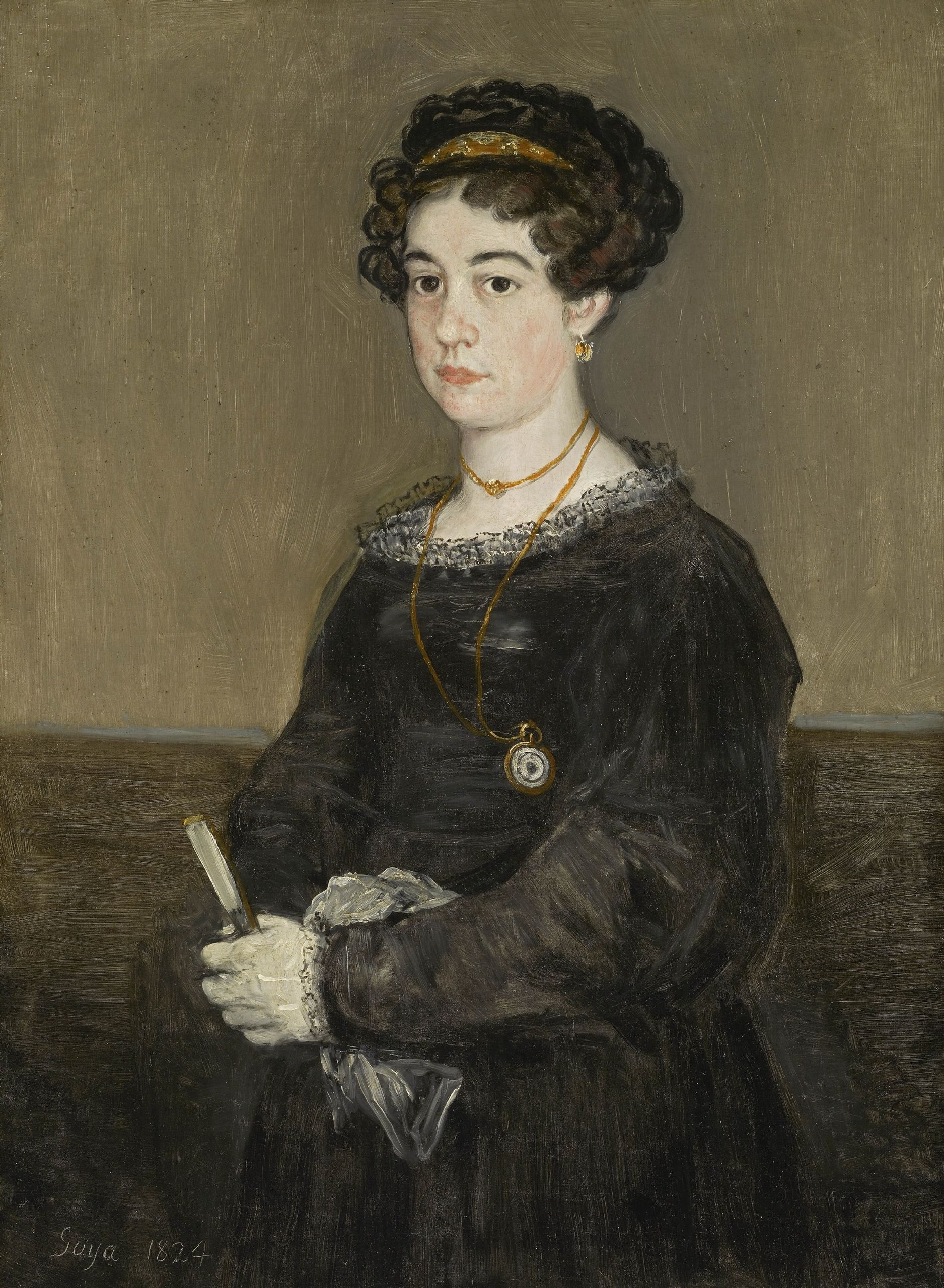 Por el año en el que está fechado, no se ha podido asegurar dónde se pintó esta obra ni quién es la modelo. Por su primer propietario, Aureliano de Beruete, se identifica tradicionalmente con María Martínez de Puga. |Imagen: Retrato de señora (María Martínez de Puga?), de Francisco de Goya y Lucientes. Óleo sobre lienzo, 1824, The Frick Collection, New York.