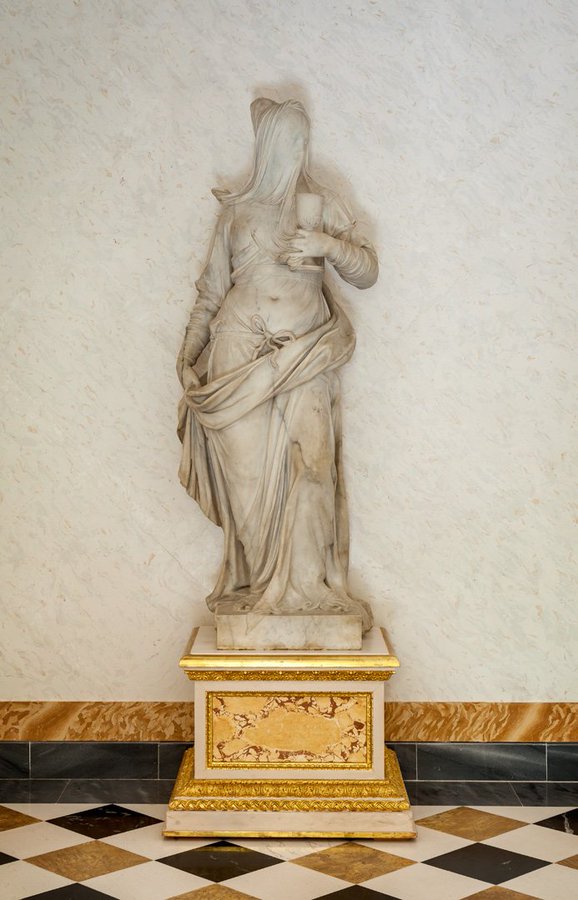 En la Sala de la Justicia del Palacio Real de La Granja de San Ildefonso se exhibe La Fe velada, de Antonio Corradini, una bella obra que custodia Patrimonio Nacional.
