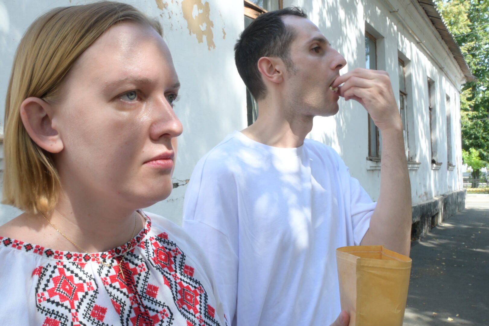 Omar Jerez come palomitas (en referencia al hecho de que Ucrania es uno de los principales exportadores de maíz del mundo) y la poeta Sofia Kosenko observa a la cámara como víctima directa de la guerra. "Ha tenido que haber sacado de Kiev, sin ningún tipo de ayuda, a su madre y abuela en uno de los momentos más violentos del conflicto, para que se desplazaran a España", indican los artistas españoles.