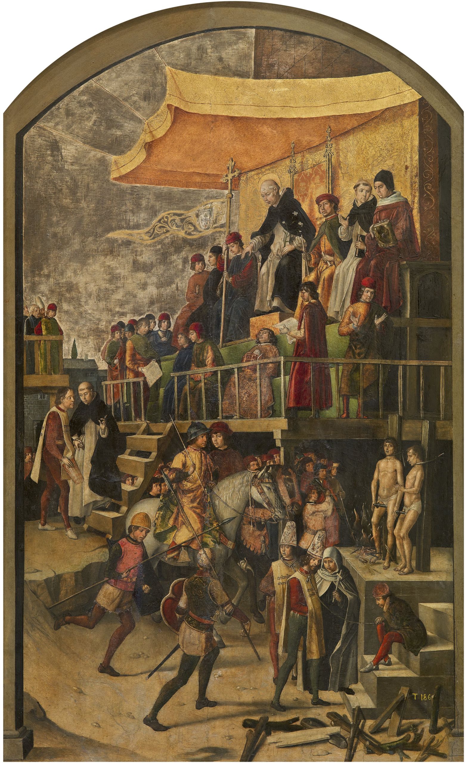 La muestra, por último, subraya la creación de imágenes y escenografías en los primeros tiempos de la Inquisición. / Imagen: Auto de fe presidido por Santo Domingo de Guzmán Pedro. Berruguete. Óleo sobre tabla, 154 x 92 cm. h. 1491-99