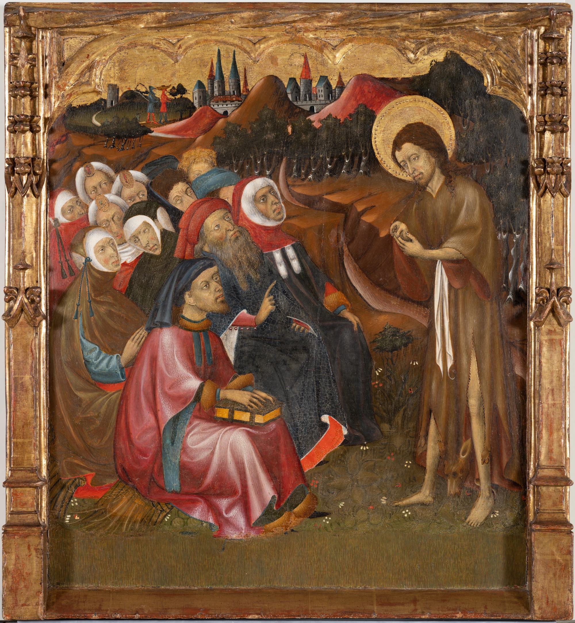 La selección de obras trata de evidenciar, de igual forma, el uso del arte para estimular la conversión de los judíos y para justificar la sincera decisión de los nuevos cristianos. / Imagen: Predicación de san Juan Bautista (parte del Retablo de los Santos Juanes de Vinaixa, Lérida). Bernat Martorell. Óleo sobre tabla, 76,5 x 70,7 x 8 cm. h. 1450