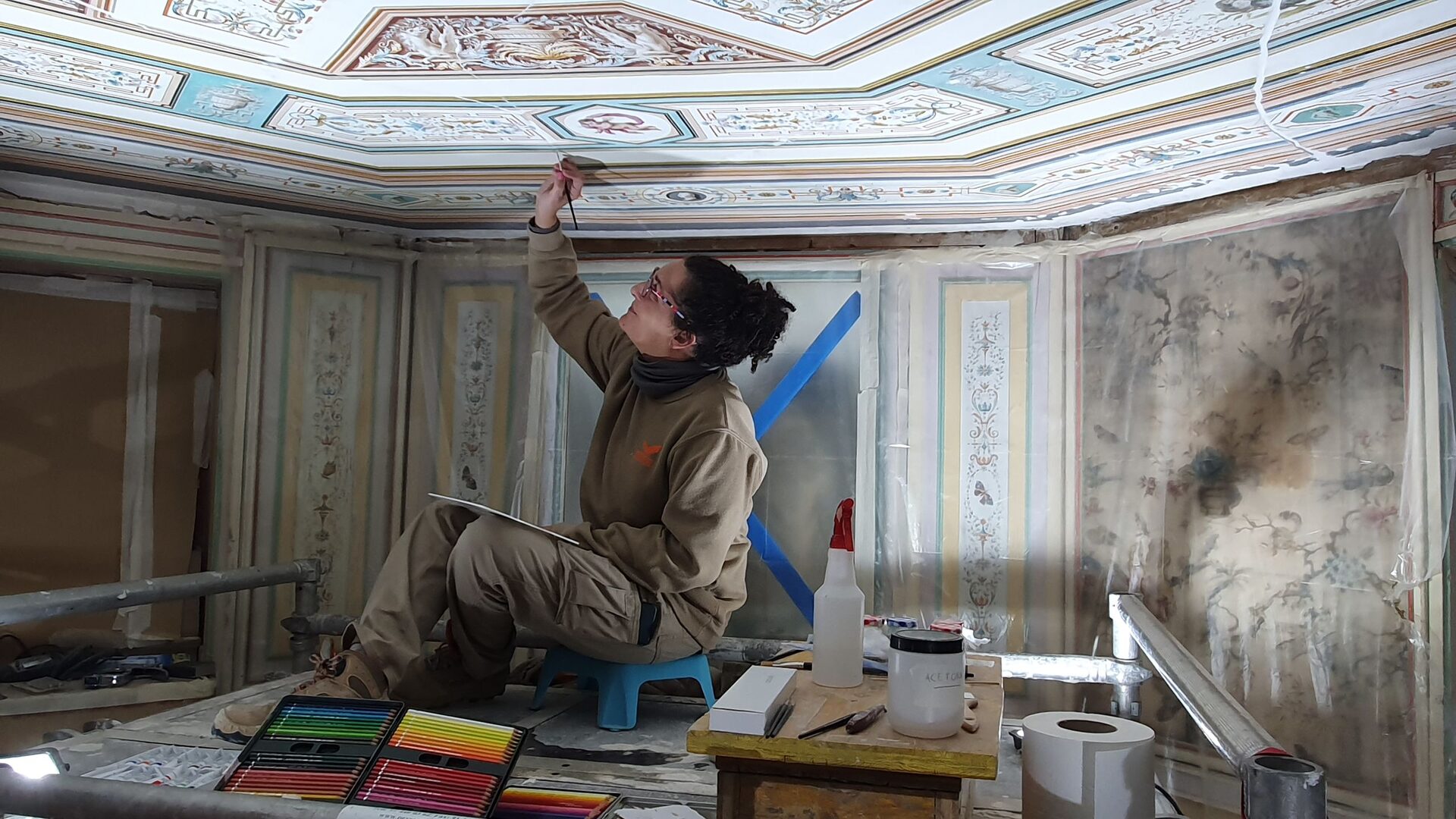 De forma paralela a los trabajos de la fachada, el departamento de restauración de Patrimonio Nacional avanza las tareas del interior del edificio. En la segunda planta se están recuperando la decoración original de los techos, pinturas murales de finales del XVIII ocultos hasta ahora por lienzos al temple. Además, en la Sala de Compañía se ha concluido la consolidación de la pintura mural Alegoría de la Diosa Cibeles de Mariano Salvador Maella, y se está reponiendo el suelo de porcelana de la Real Fábrica del Buen Retiro de Madrid.