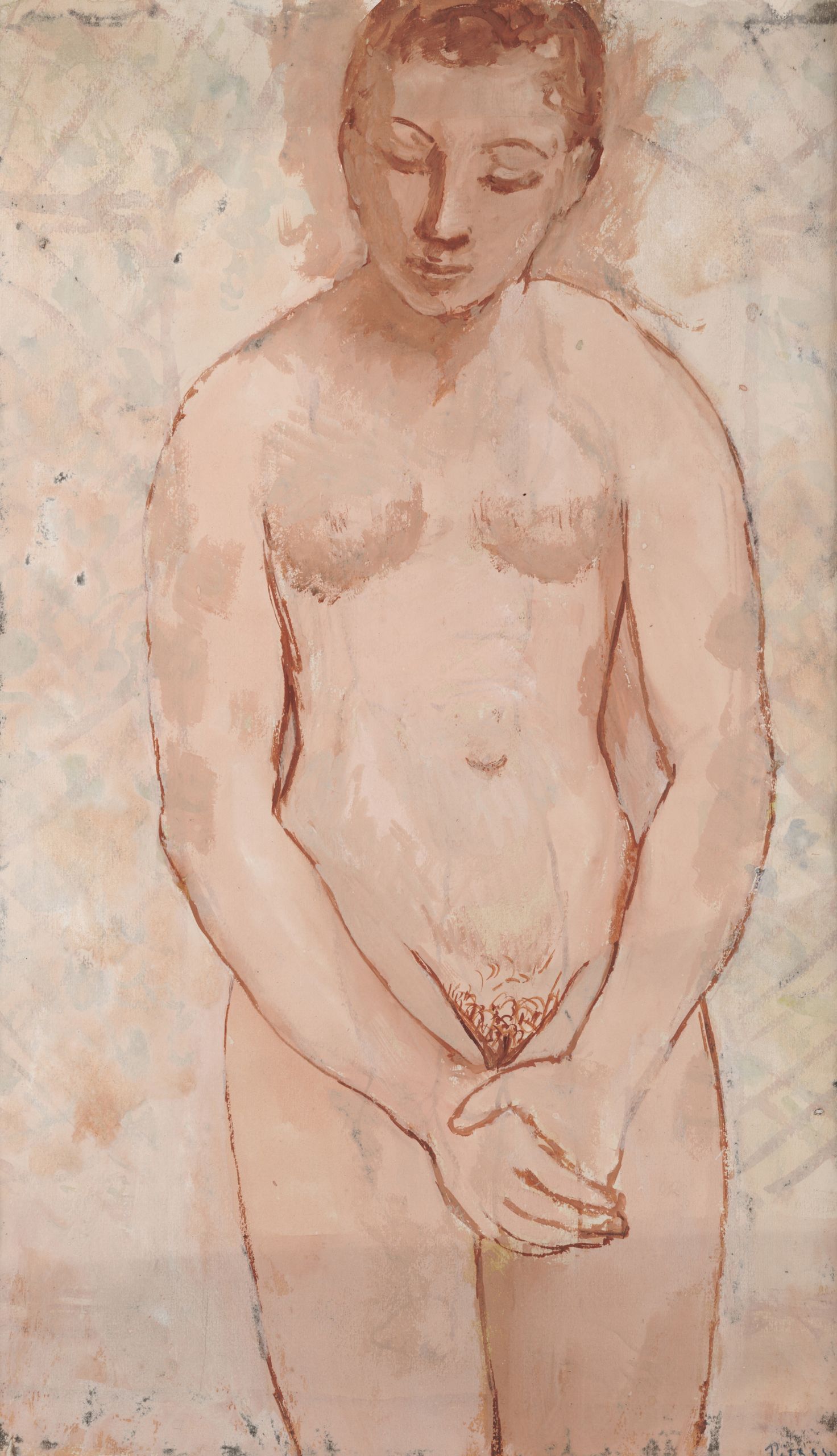 Picasso introduce un nuevo concepto de desnudo, distinto al académico, y ve en el cuerpo un lugar de experimentación lingüística y cultural. Introdujo un nuevo estilo de sensualidad, especialmente relevante en el desnudo masculino. / Imagen: Desnudo con las manos cruzadas