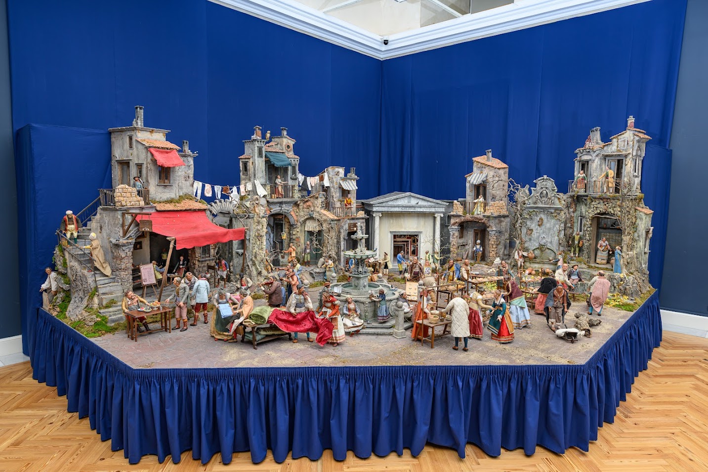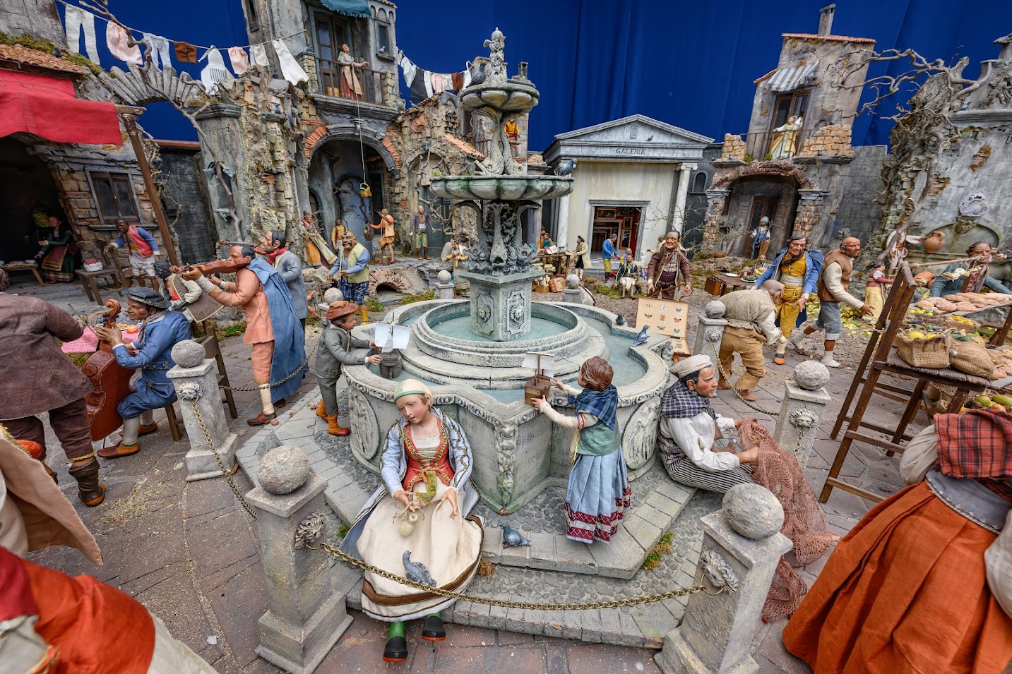 Este año, vuelve a ocupar un lugar preeminente el mercado popular, donde se ha incorporado como novedad una escena típica napolitana en la que una mujer sube desde el balcón la cesta de la compra con una cuerda. No faltan otras figuras tradicionales como los pastores o el demonio.