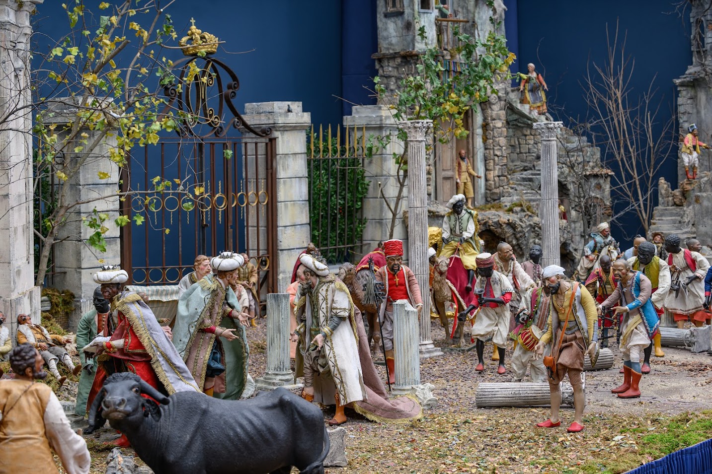 La Cabalgata de los Reyes Magos tiene esta Navidad un especial protagonismo. Un gran séquito, que incluye todo tipo de personajes y animales, parte desde un templete romano rumbo al nacimiento que se ubica en una réplica del zaguán del Palacio Real.