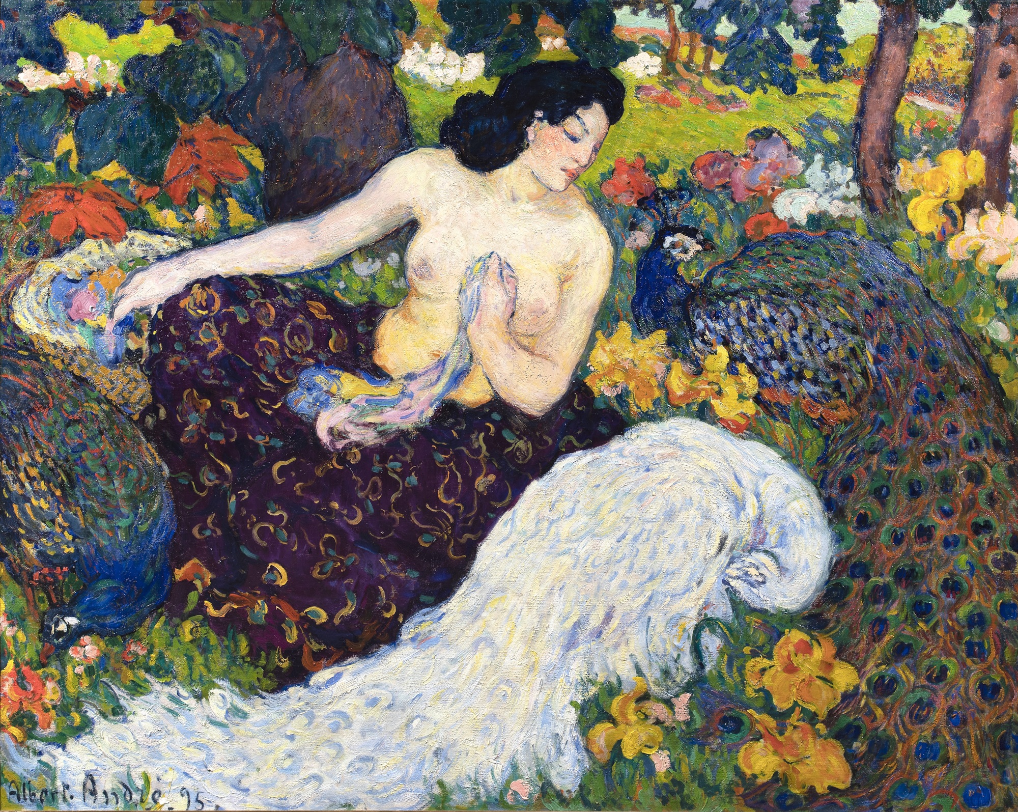 Para finalizar el año 2024, se abrirán en Madrid, en la Fundación Mapfre, la exposición Paul Durand-Ruel y los últimos destellos del impresionismo, para dar a conocer la figura del marchante y mecenas y mostrar la obra de una serie de artistas de la generación postimpresionista cuyo trabajo no ha sido lo suficientemente estudiado, algunos de ellos (Henry Moret, Maxime Maufra y Gustave Loiseau) muy afines al impresionismo, y otros (Georges D’Espagnat y Albert André) más alejados. | Imagen: Albert André. La femme au paon, 1895. Colección particular