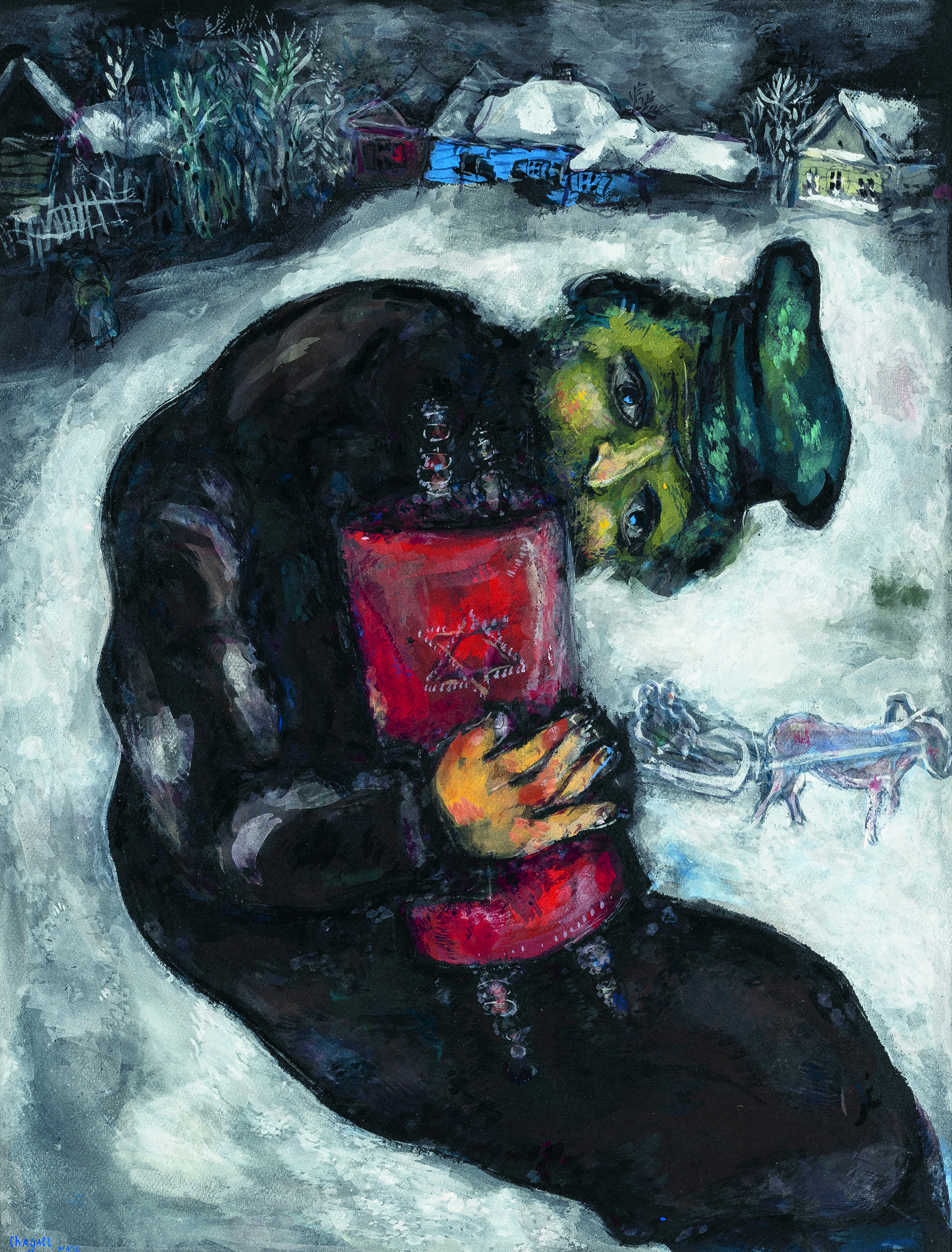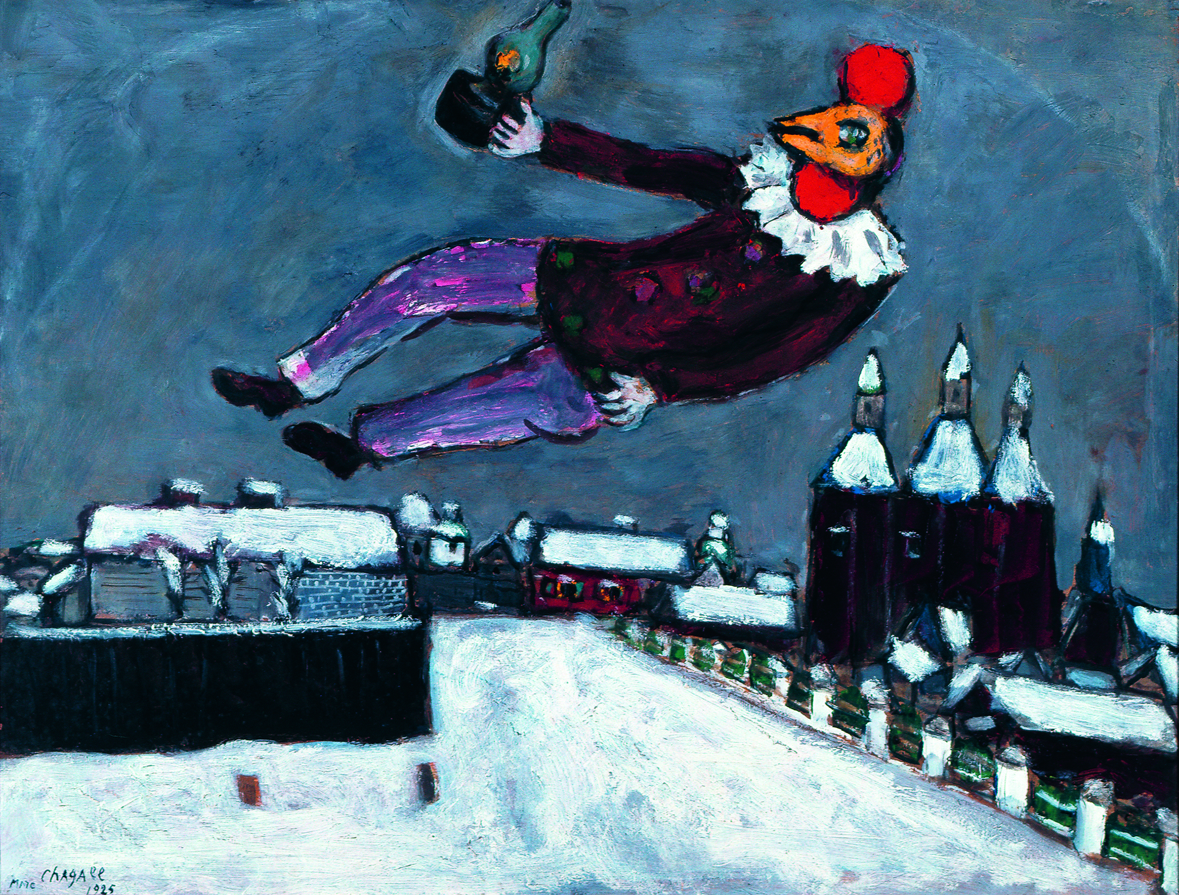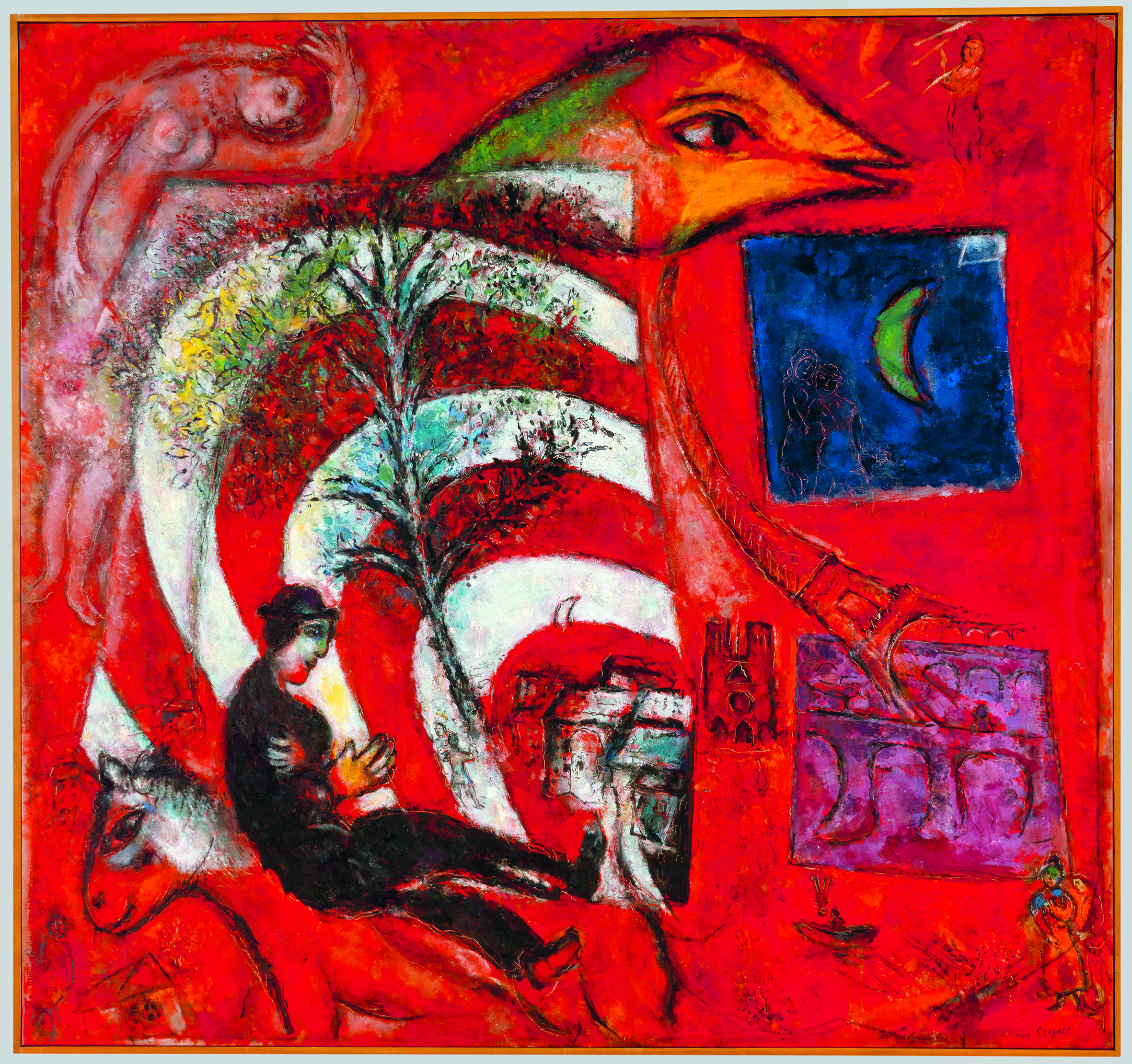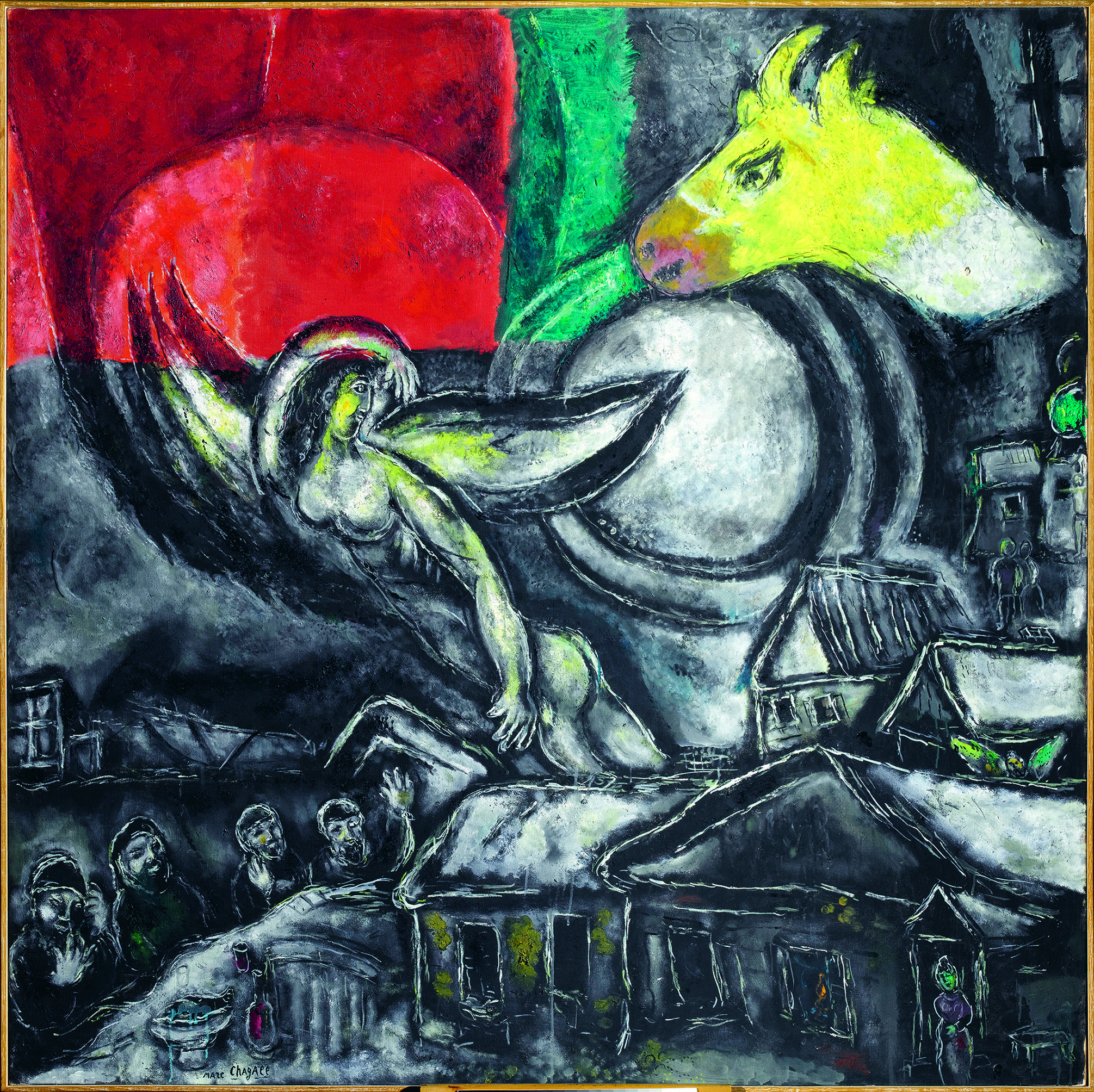 Este Hombre-gallo sobre Vítebsk encarnaría al propio artista como expresión del deseo vital de superar las fronteras y los límites impuestos. | Archives Marc et Ida Chagall, Paris