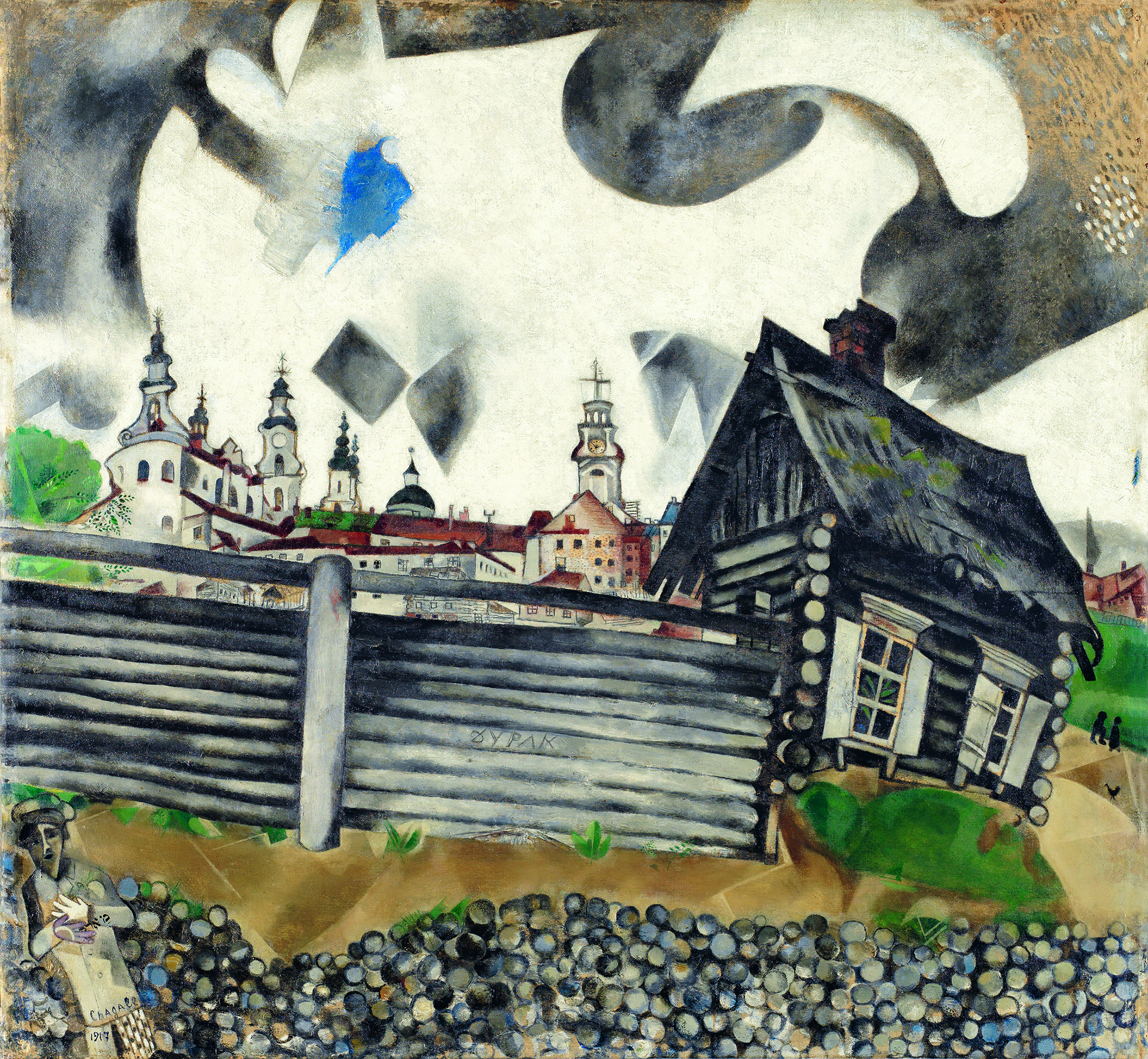 La casa gris forma parte de una serie de pinturas que Chagall realizó de Vitebsk, su ciudad natal, tras el comienzo de la Primera Guerra Mundial. Combina su aprendizaje cubista fruto de sus años de residencia en París con elementos fantásticos. | Museo Nacional Thyssen-Bornemisza, Madrid