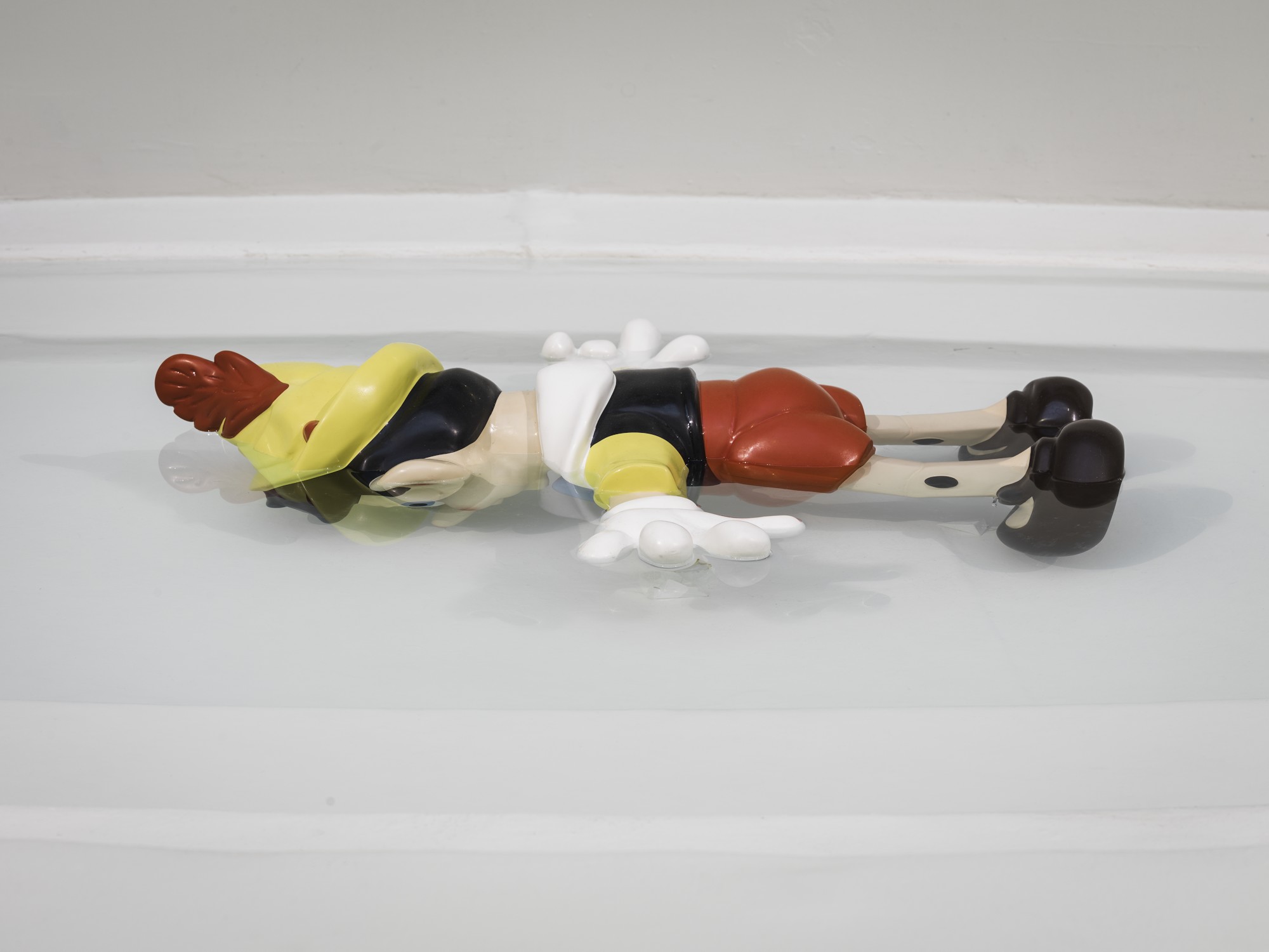 Maurizio Cattelan interactúa con iconos familiares, presentando al personaje Pinocho, de la película animada clásica de Walt Disney de 1940, en un cuadro trágico. | Maurizio Cattelan. Daddy, Daddy, 2008. Solomon R. Guggenheim Museum, New York, Donación anónima 2012.3 © Maurizio Cattelan