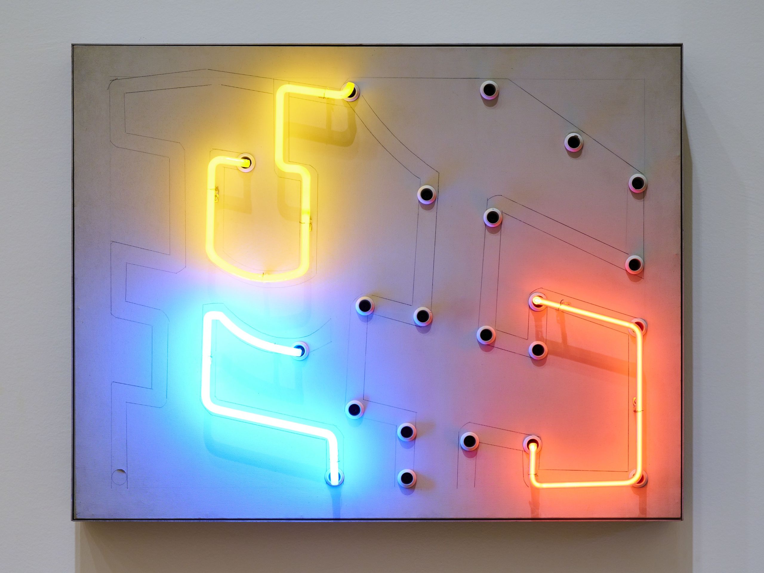 La artista de origen griego Chryssa llegó a Nueva York a mediados de los años cincuenta y se inspiró en los rótulos luminosos de Times Square que, en su opinión, eran el paradigma de la modernidad y la imbricación de lo vulgar y lo poético en la cultura estadounidense. | Chryssa. Estudio constructivo para Eso es todo (Construction study for That's All), 1969–70. Neón y grafito sobre lienzo con imprimación, sobre madera. Solomon R. Guggenheim Museum, Nueva York, Donación, Michael Bennett 80.2720 © Estate of Chryssa, 2024 Courtesy Mihalarias Art, Athens, Greece.