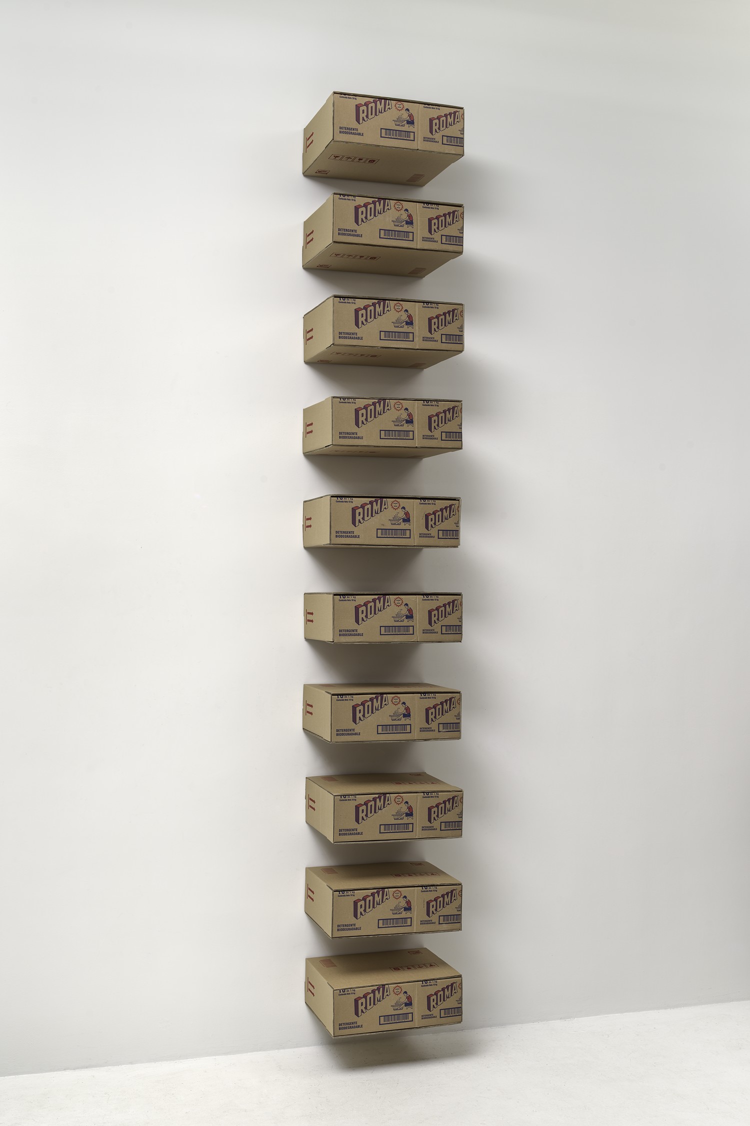 Artistas contemporáneos como José Dávila y Lucía Hierro ampliaron el legado del Pop a través de obras que critican la cultura consumista, incorporando referencias mexicanas y dominicanas que reflejan su propia herencia. | Jose Dávila. Sin título, 2017. Cajas de cartón y tapones de botella. Solomon R. Guggenheim Museum, Nueva York, Donación, Mirella and Dani Levinas 2020.1 © Jose Dávila, VEGAP, Bilbao, 2024