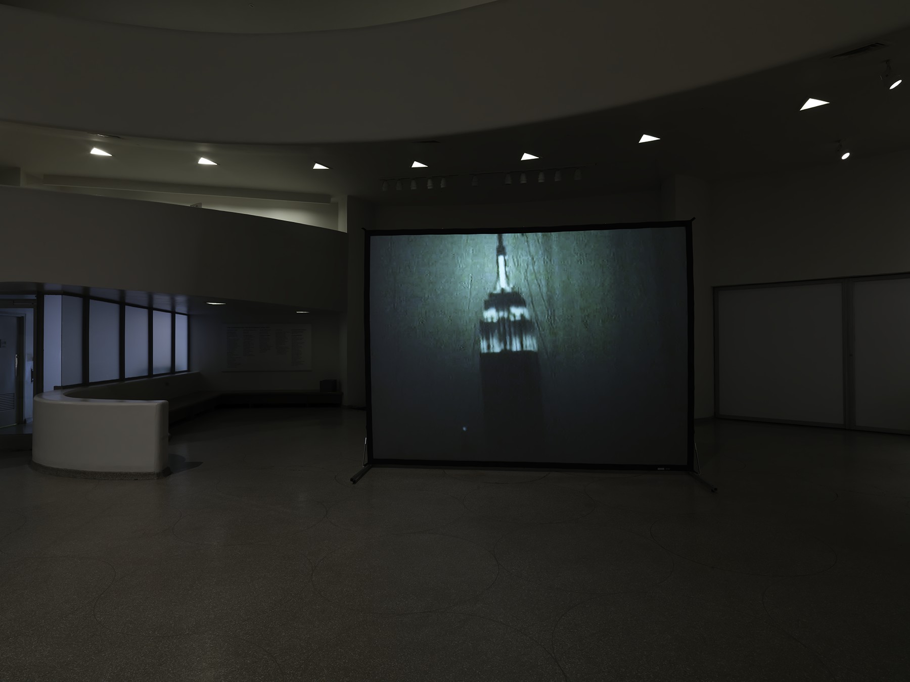 Douglas Gordon se involucra en la historia del Arte Pop imitando los autorretratos de Warhol y, en el caso de la obra que se expone en esta galería, apropiándose directamente del metraje original de la película Imperio (Empire, 1965) de Warhol durante una proyección que tuvo lugar en Berlín. | Douglas Gordon. Versión pirata (Imperio), 1998. Vídeo en color, sin sonido. Guggenheim Museum, Nueva York, donación del artista 2004.99 © Studio lost but found, VEGAP, Bilbao, 2024
