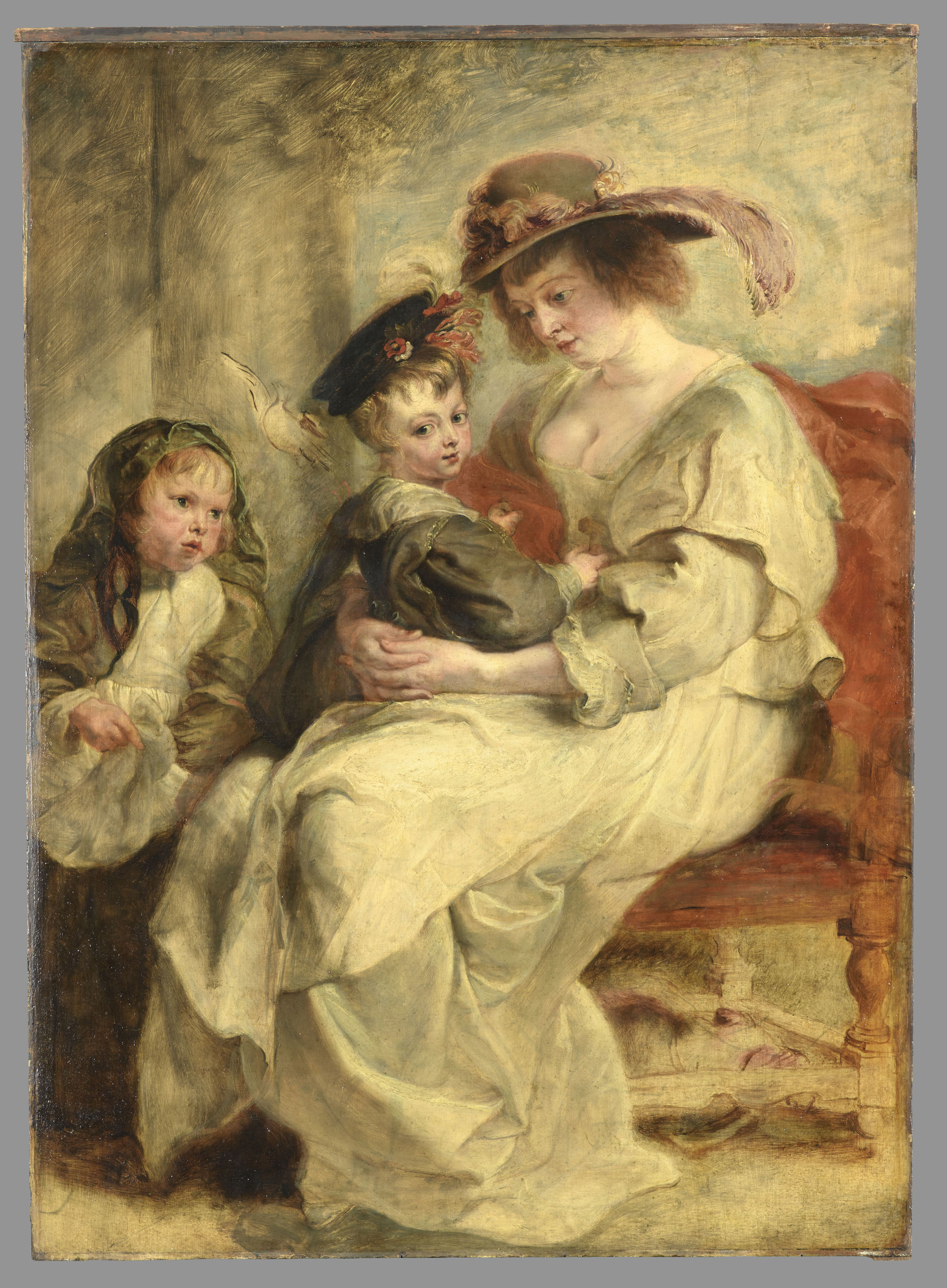 Cuadros como este, inacabados, nos permiten descubrir la técnica de pintar por fases que se utilizaba en época de Rubens. Se avanzaba por capas: sobre la imprimación se aplicaba el dibujo, sobre este, el bosquejo y, sobre el bosquejo, el color en capas más o menos transparentes. Esto permitía al maestro y sus ayudantes alternar su trabajo. | Hélène Fourment con sus hijos de Clara-Johanna y Frans, de Pedro Pablo Rubens. Óleo sobre tabla, h. 1636.