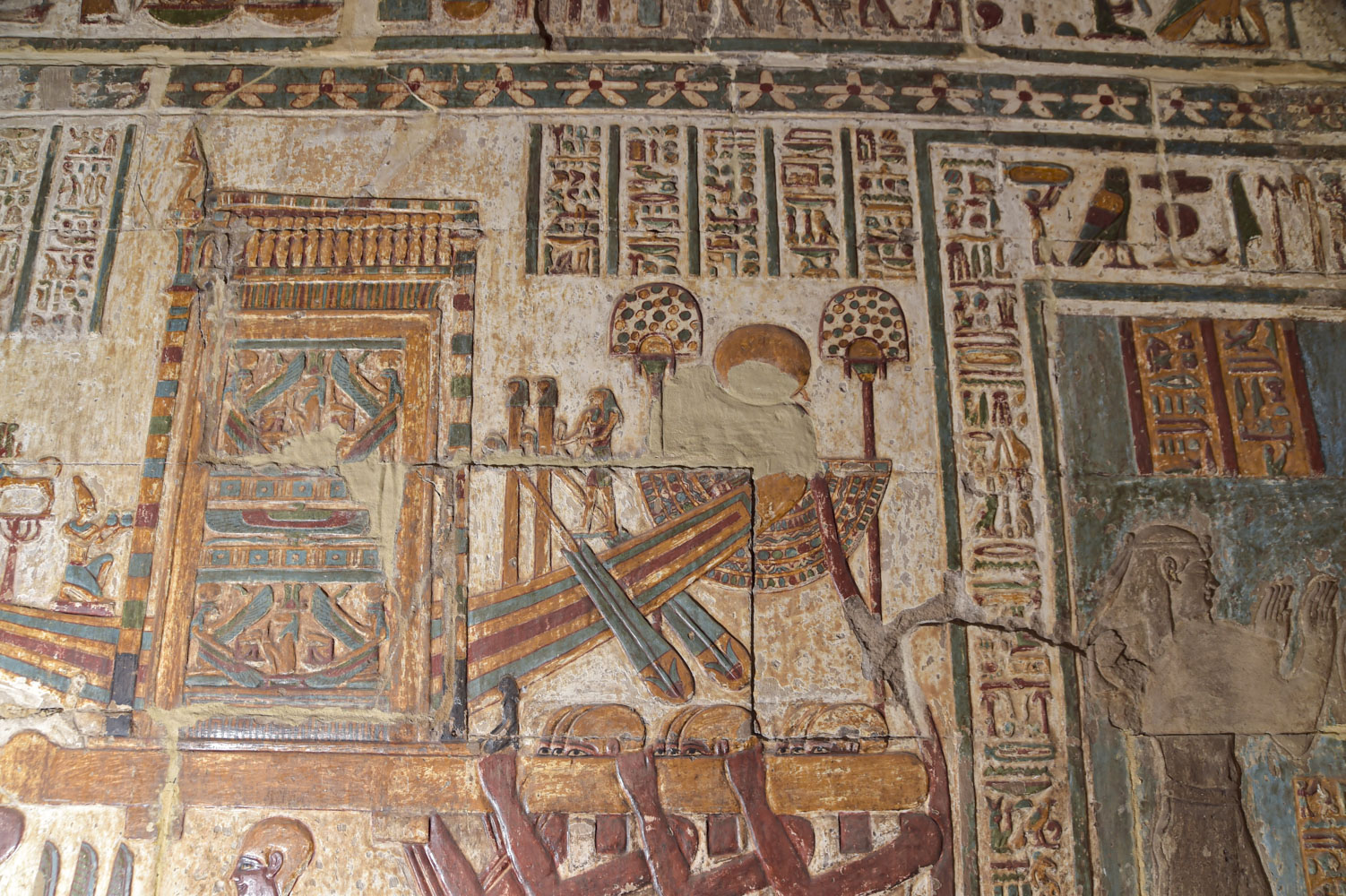 A lo largo de 1.800 años, los fuegos encendidos por los residentes locales dentro del vestíbulo oscurecieron las paredes y columnas, escondiendo los brillantes colores que una vez embellecieron el templo. Un grupo de hasta 30 restauradores egipcios, bajo la dirección de Ahmed Emam, ha logrado limpiar estas superficies, desvelando detalles impresionantes. Las representaciones astronómicas del techo y los colores de las 18 columnas internas han recuperado la viveza de sus pigmentos originales.