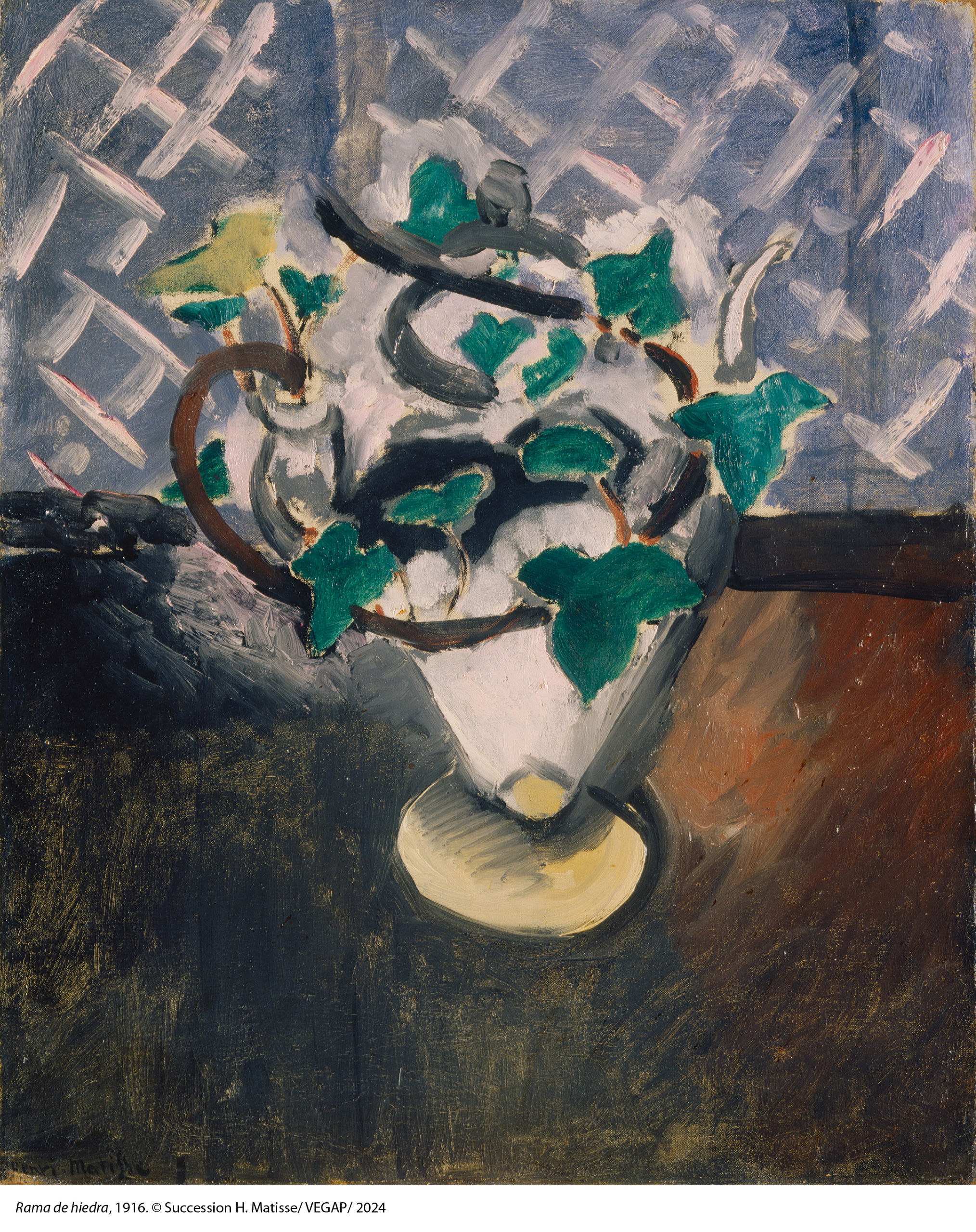 Las esculturas de Matisse se muestran acompañadas por 23 dibujos y litografías, y un lienzo, fotografías y documentos de la época, además de dos esculturas de Aristide Maillol. | Henri Matisse. Rama de hiedra, 1916. Óleo sobre lienzo. Kunsthaus Zürich. Legado de Gustav Zumsteg, 2005. © Succession H. Matisse/ VEGAP/ 2024.