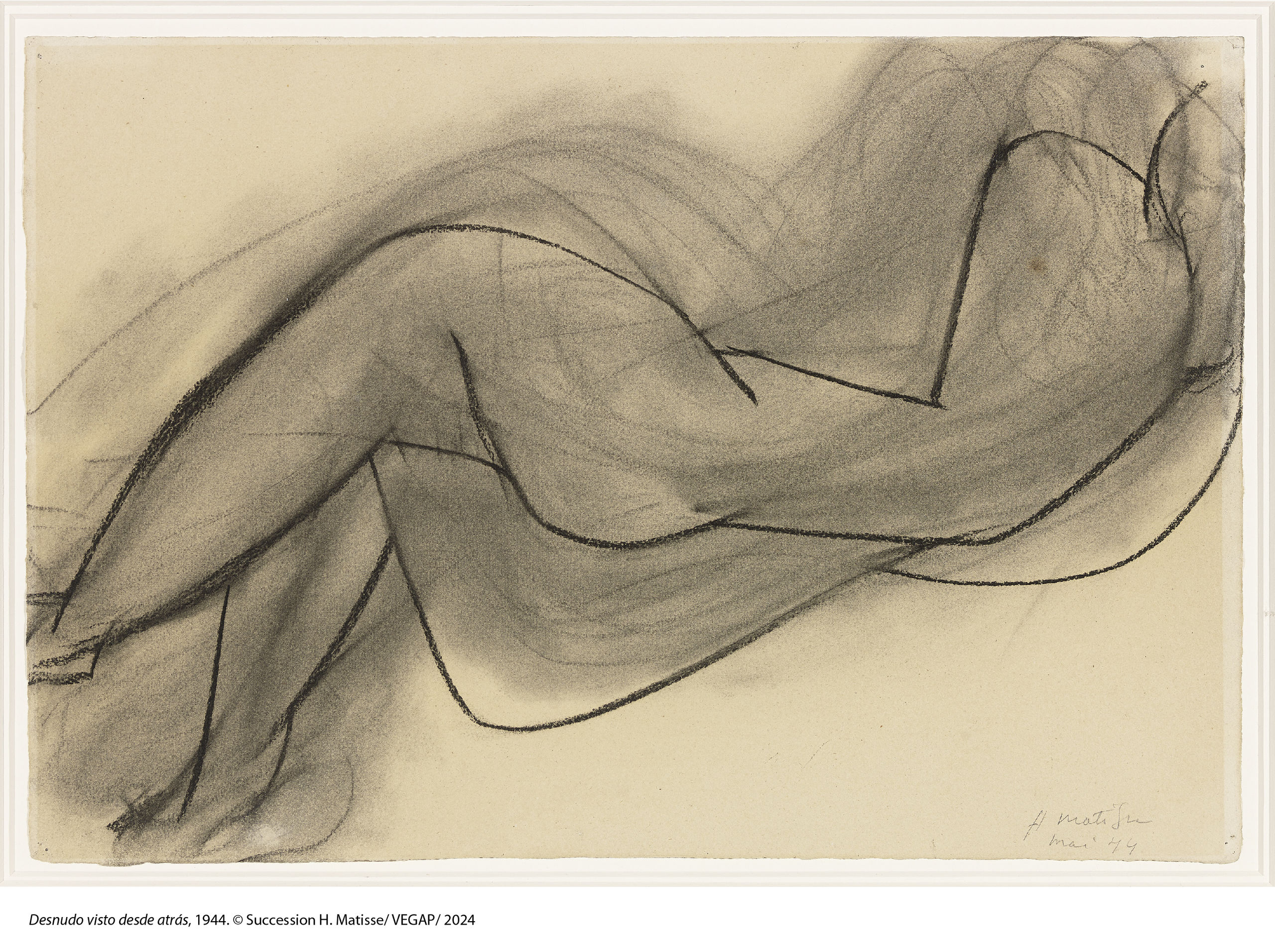 Como es sabido, Matisse fue siempre un entusiasta del dibujo. Al igual que su escultura, sus dibujos y grabados tienen entidad propia y autonomía. Por su versatilidad y facilidad, su práctica le ayuda a visibilizar el proceso creativo y las diferentes etapas de su trabajo. | Henri Matisse. Desnudo tumbado visto desde atrás, 1944. Carboncillo sobre papel. Museo Matisse de Niza. © Succession H. Matisse/ VEGAP/ 2024.