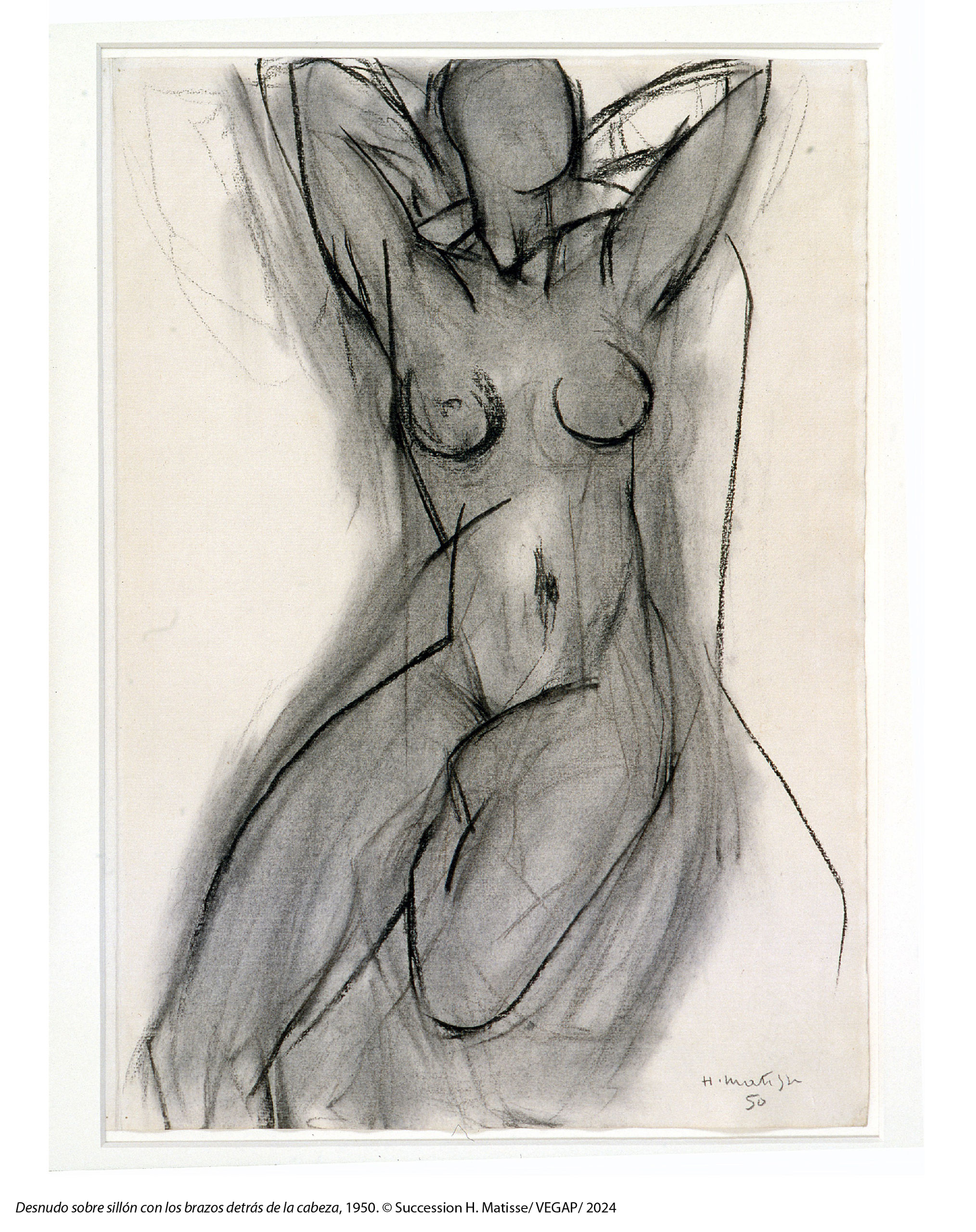 Henri Matisse. Desnudo sobre sillón con los brazos detrás de la cabeza, 1950. Carboncillo sobre papel vitela. Museo Matisse de Niza. © Succession H. Matisse/ VEGAP/ 2024.