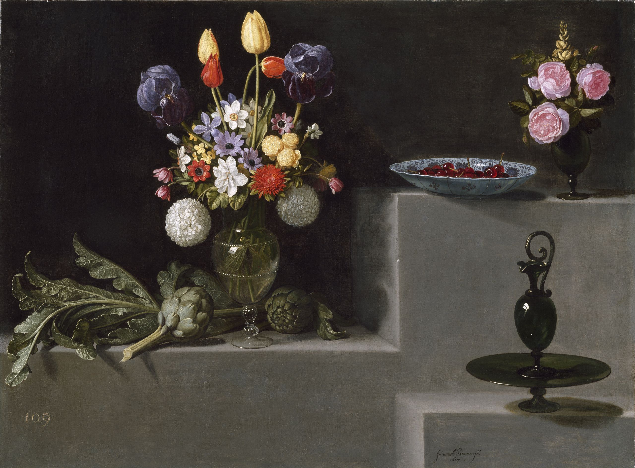 Este itinerario recorre un amplio abanico temporal, desde la escultura romana hasta comienzos del siglo XVIII, para descubrir cómo en la pintura, la representación de flores y plantas nos puede hablar de la simbología mitológica, religiosa, nobiliaria o costumbrista para transmitir a la escena cualidades que les son propias. | Bodegón con alcachofas, flores y recipientes de vidrio, de Juan van der Hamen. Óleo sobre lienzo, 81 x 110 cm. 1627.