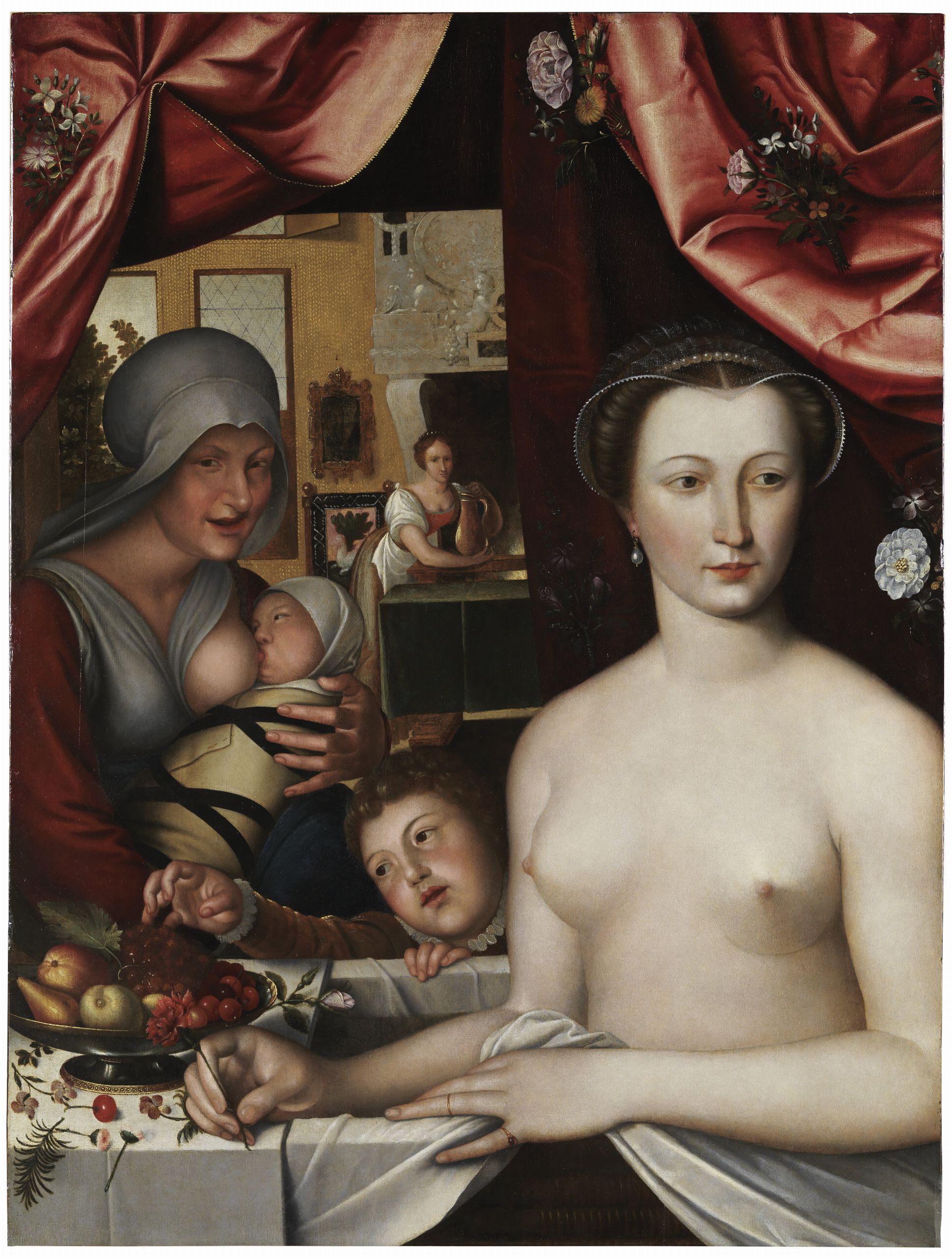 En el gótico se buscaba la precisión y la descripción correcta de cada planta, de cada flor. El retrato botánico adquiere una entidad propia en las obras de arte, que culmina en el Renacimiento. En ese periodo, y como herencia de siglos anteriores, las plantas abundan en el primer término con un destacado estilo naturalista. | Mujer en el baño (¿Diana de Poitiers?). Taller de François Clouet. Óleo sobre tabla de madera de roble, 92,4 x 70 cm. Hacia 1566.