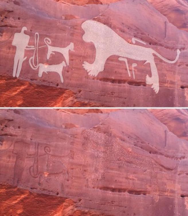 Esta escena de caza con león y dos perros encontrada en el noroeste de Arabia Saudita tiene entre 8.000 y 9.000 años. Es posiblemente la representación de perros más antigua hallada hasta la fecha, según un estudio publicado en Journal of Anthropological Archaeology. Otras pinturas de la zona también muestran que las antiguas tribus utilizaban perros domesticados a los que sujetaban con correas.