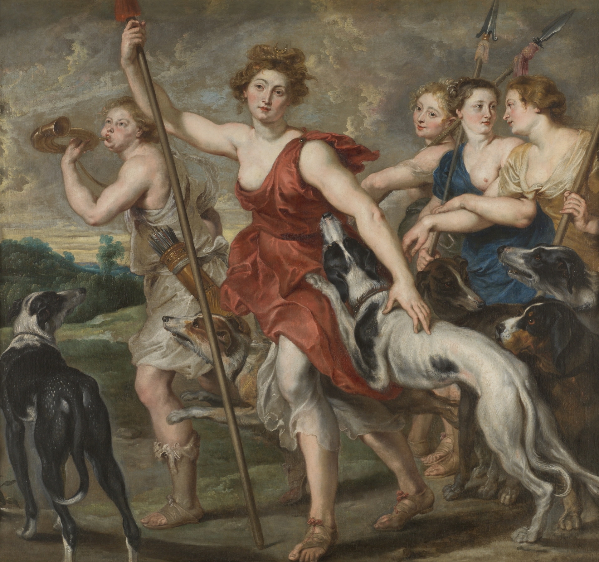 Esta pintura muestra una cacería de Diana con sus ninfas. Según la mitología, el cazador Acteón la vio bañarse en el bosque junto a sus ninfas y, como castigo, la diosa convirtió al joven en un ciervo al que sus propios perros descuartizaron. En este cuadro, los perros muy posiblemente fueron pintados por Paul de Vos, un especialista en pintar animales que colaboró con Rubens con asiduidad.