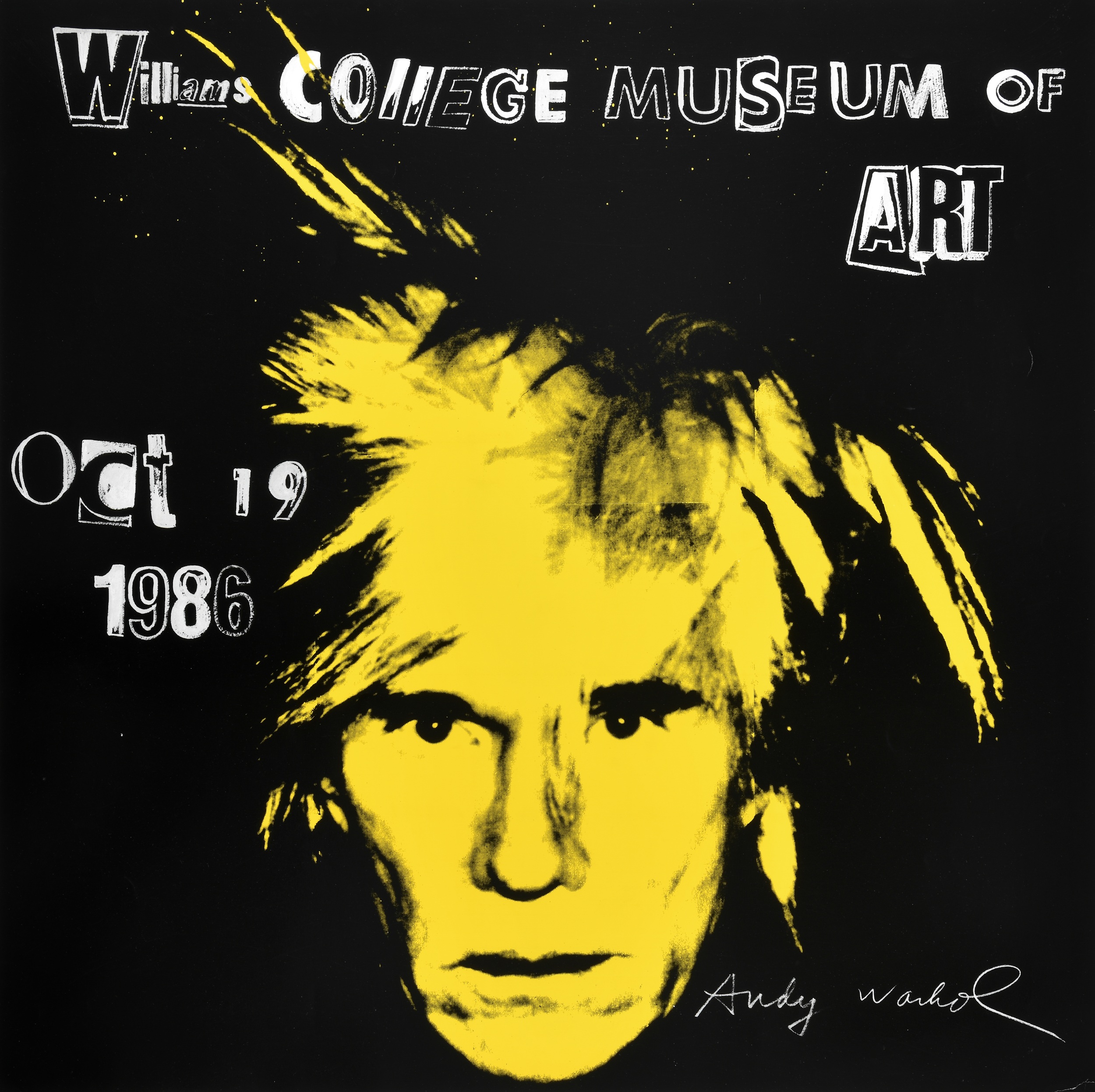 Este es uno de los últimos carteles realizados por Warhol, cuatro meses antes de su muerte. Se trata de un autorretrato coloreado de 1986 que sirvió como punto de partida para una serie de pinturas serigrafiadas, y que tenía como destino ser el cartel de una exposición en el Museo de Arte del Williams College en Massachusetts. | Autorretrato. Exposición en el Museo de Arte del Williams College, Williamstown, Massachusetts. Serigrafía, 1986. Cartel.