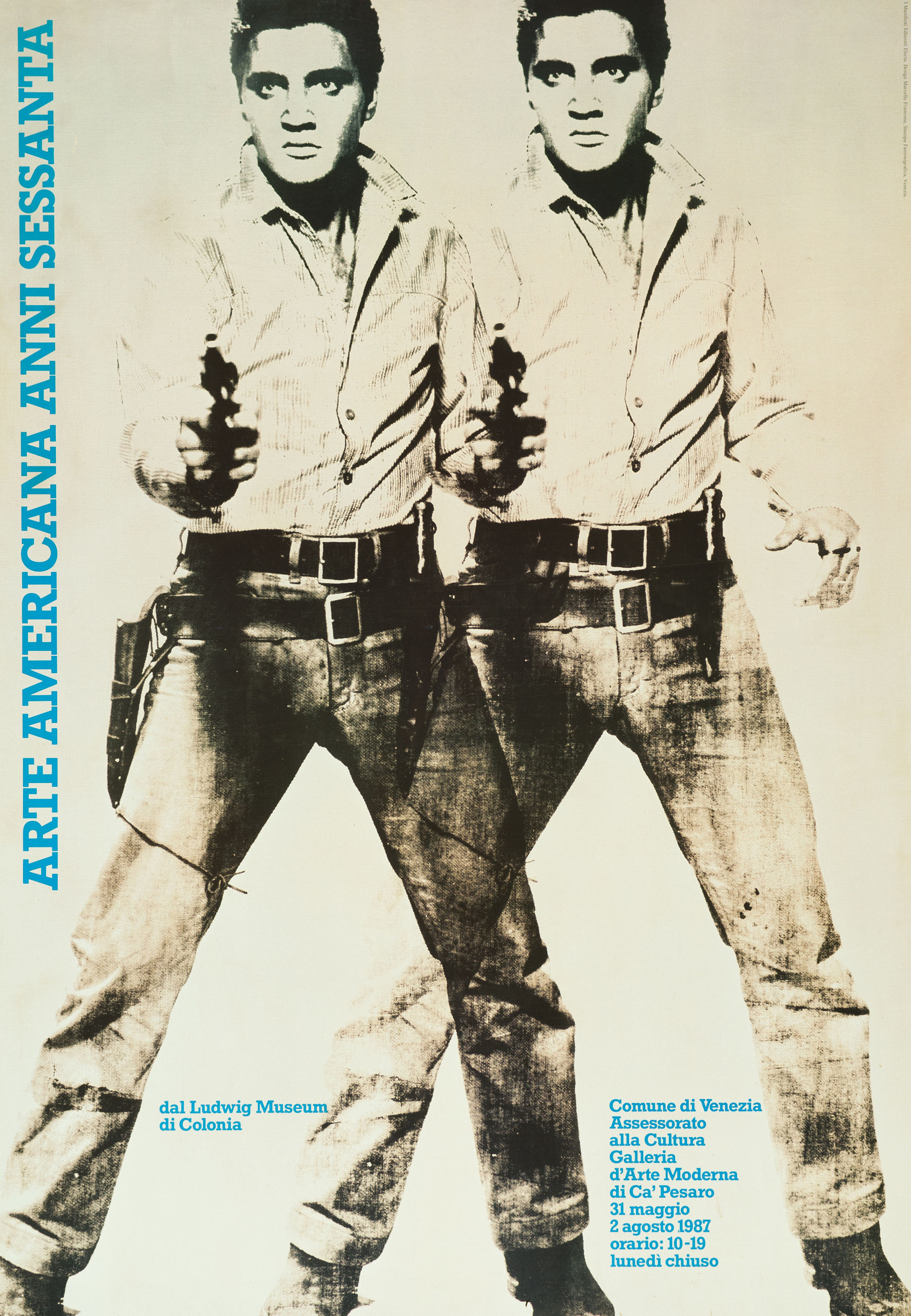 Jugando con los conceptos de icono y objeto, realizó una serie de serigrafías de celebridades como Elvis Presley, Mick Jagger, Elizabeth Taylor o Jaqueline Kennedy, que reciben una frívola veneración en la era del entretenimiento. | Elvis. Exposición Arte americano de los años 60. Impresión offset, 1989. Cartel.