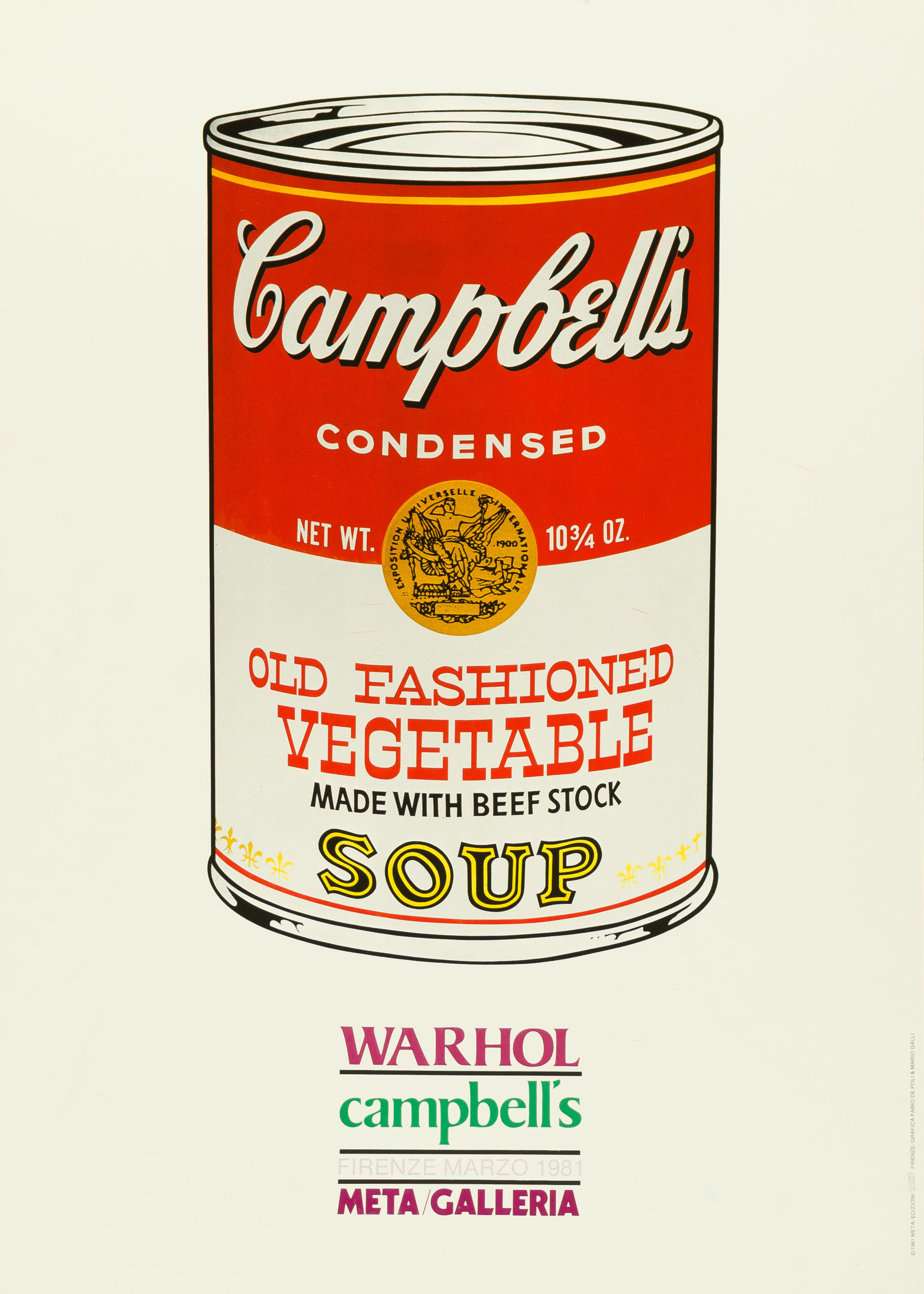 Estas latas son uno de los motivos más asociados a Andy Warhol. La obra original data de 1962, consta de 32 lienzos, uno por cada tipo de sopa, y se conservan en el MoMa de Nueva York. El ejemplar de cartel que se muestra pertenece a una exposición que se realizó por Europa en sus últimos años de vida. | Lata de sopa Campbell. Exposición en Meta Galleria, Florencia. Impresión offset, 1981. Cartel.